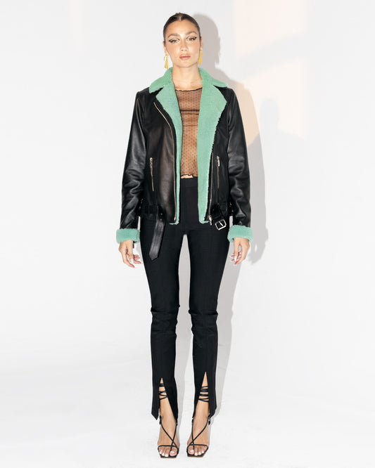Gaia Shearling Leather Jacket Black x Green
