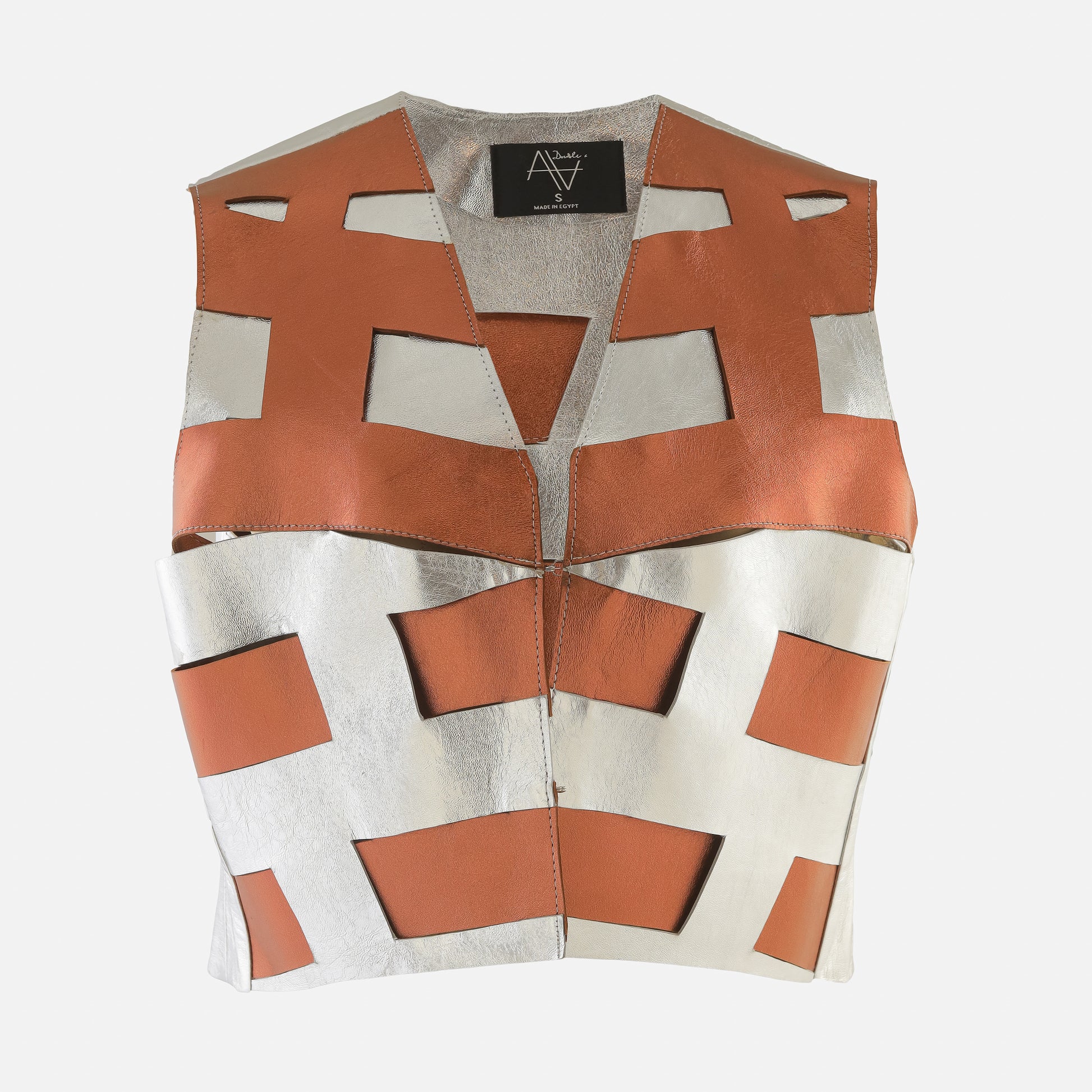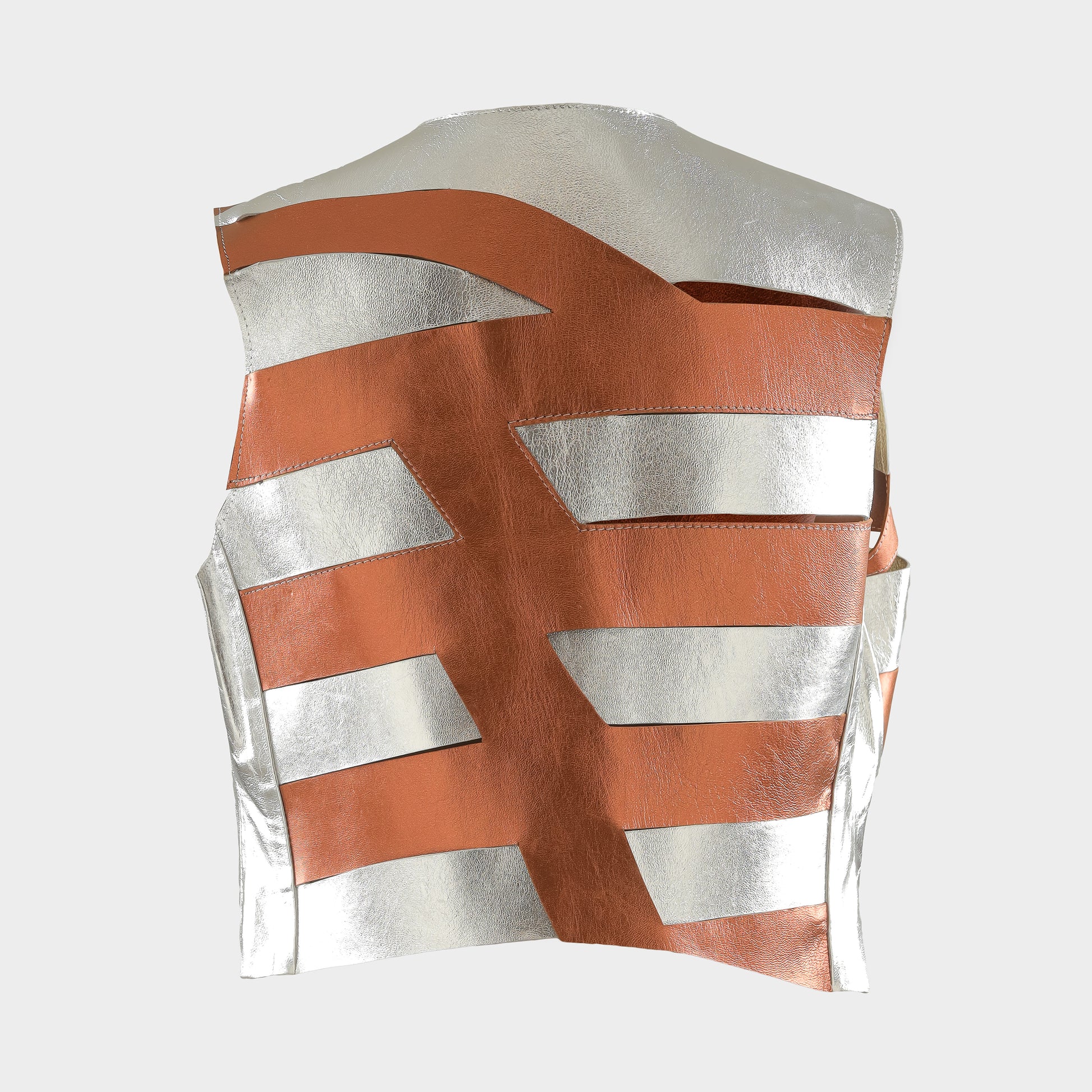 - Metallic cropped leather vest featuring linear leather cuts