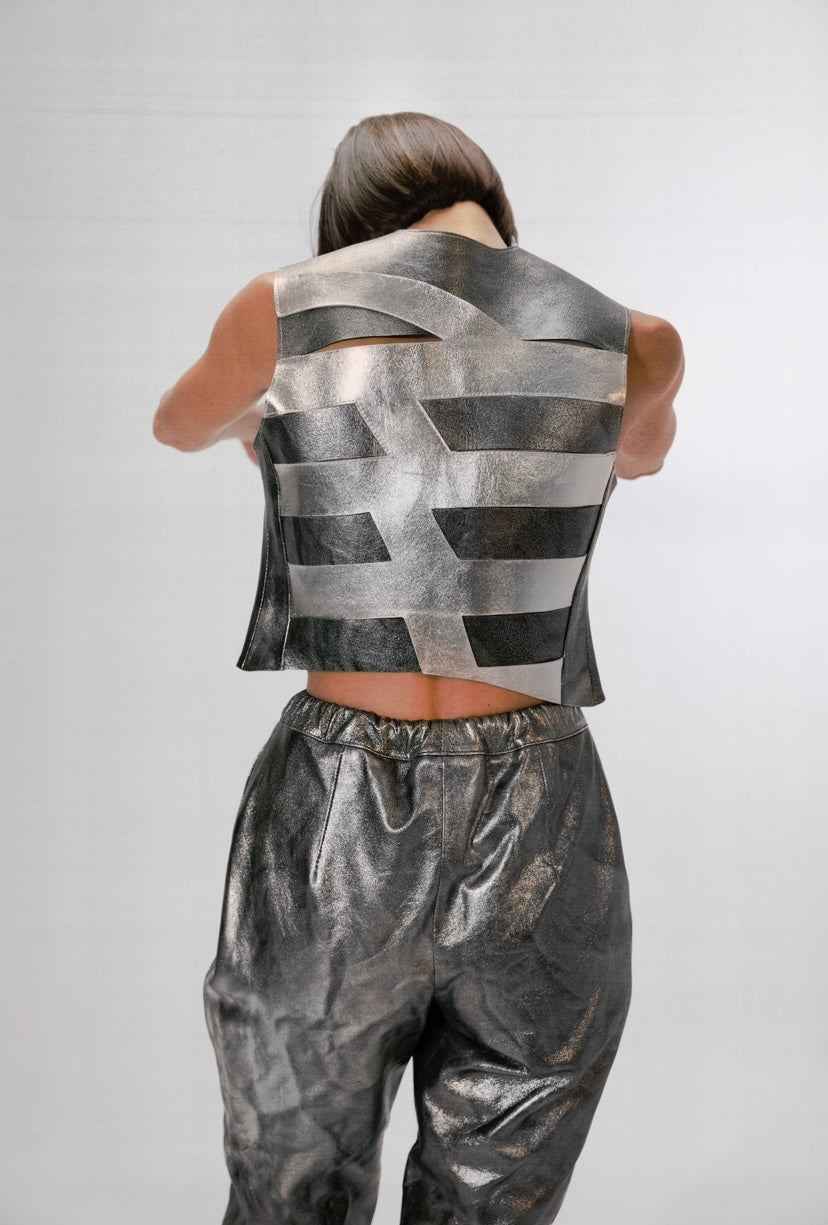 - Metallic cropped leather vest featuring linear leather cuts