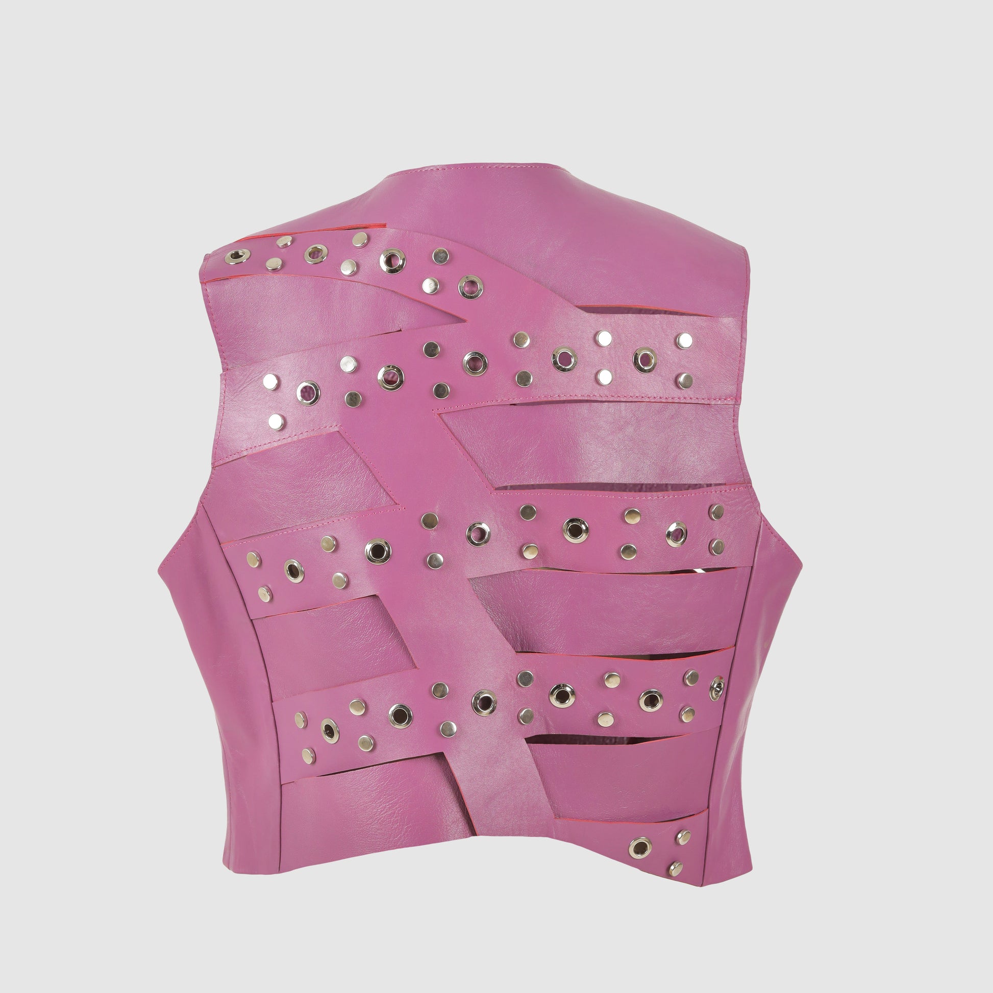 - Metallic cropped leather vest featuring linear leather cuts embellished with studs and eyelets
