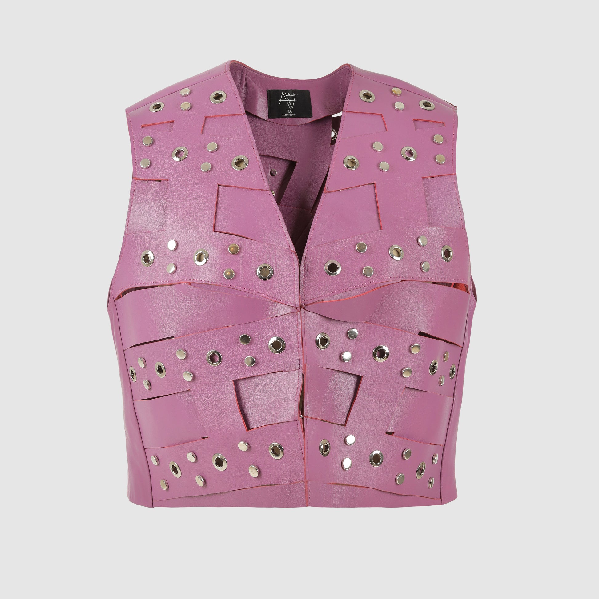 The Aiden vest is a cropped fit vest, it features linear cutouts embelished with studs and eyelets were it makes the perfect balance between edgy style and elegance.