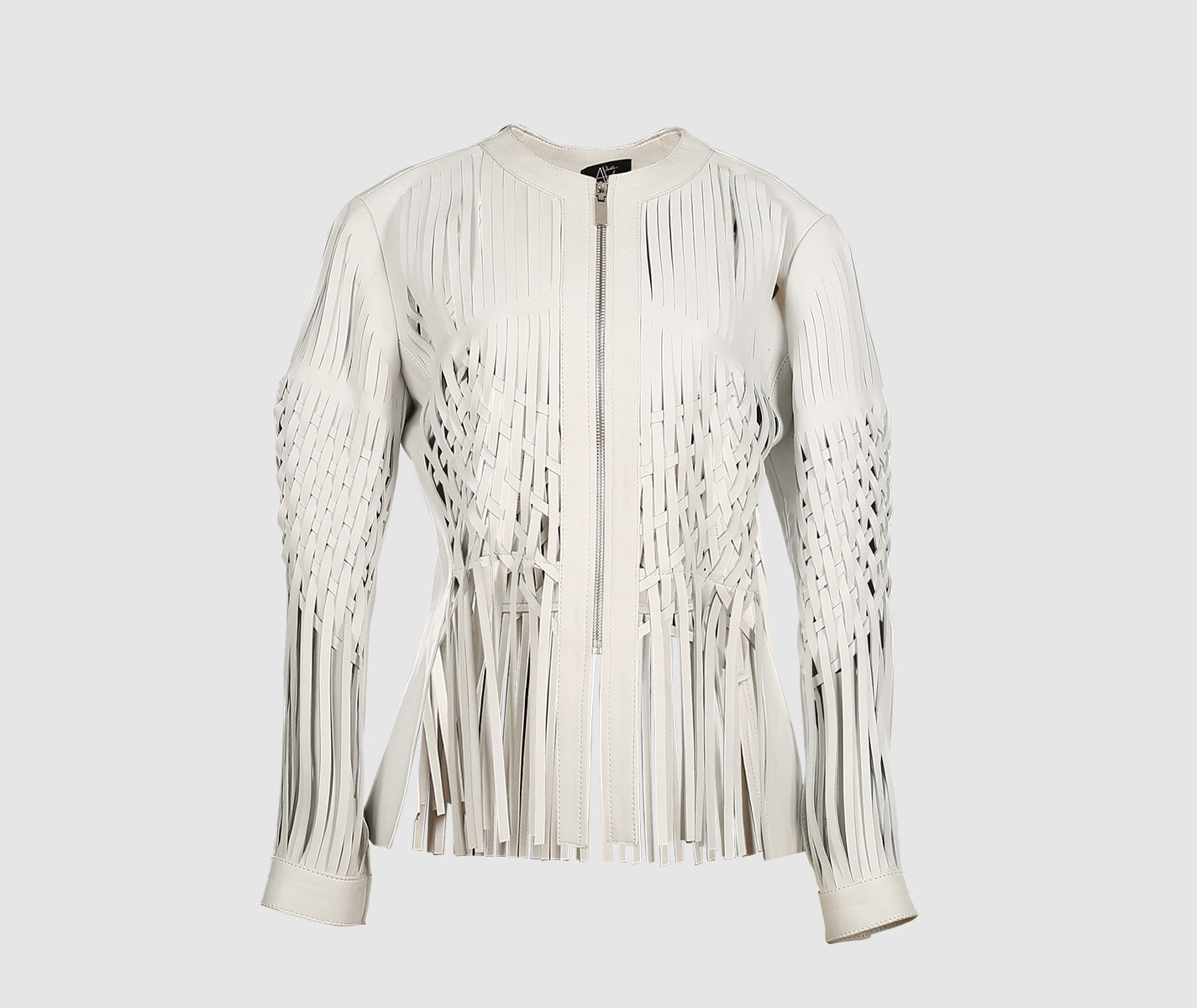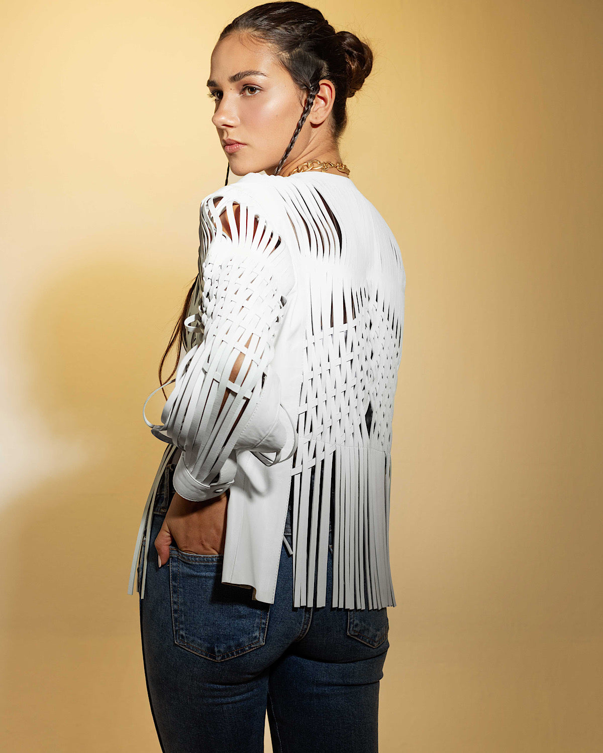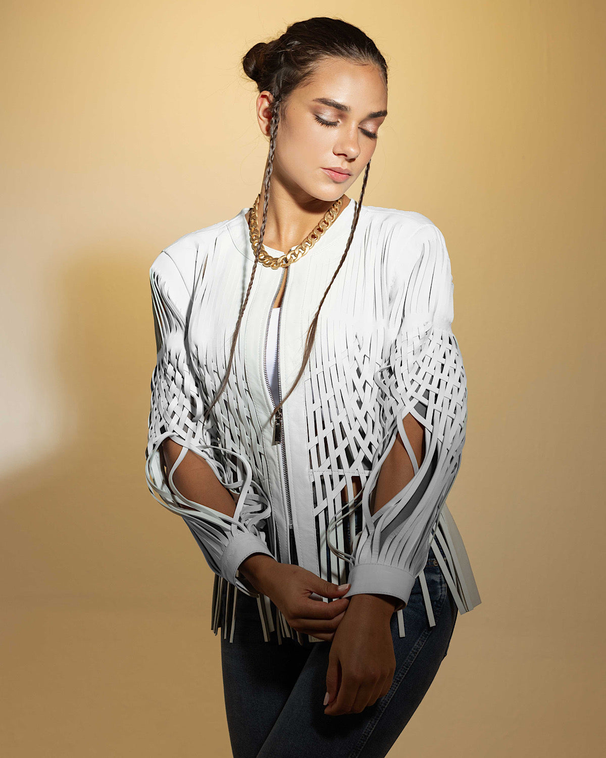 The Attalea leather Jacket is one of Double A’s signature designs, it is a straight fit woven fringed Jacket with a round neckline and a metal zip fastening at the front. It can be dressed up or down, casually or formally, in winter or summer. It is truly the piece that you will rely on to popup your outfit.