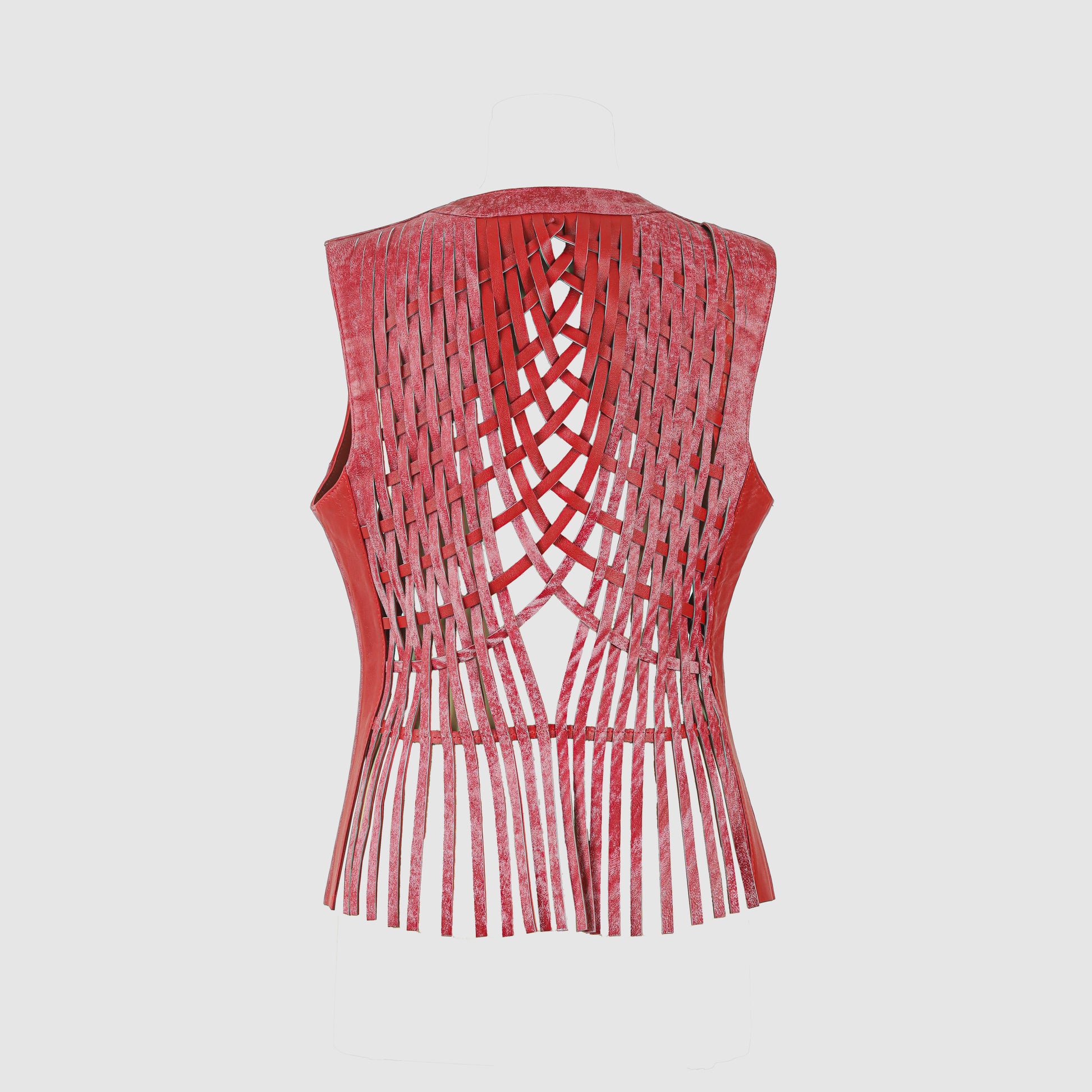 The Attalea leather vest II is one of Double A’s signature designs, it is a straight fit woven fringed vest with a v-neckline and a double metal hook fastening at the front. Featuring a brilliant color combo. It can be dressed up or down, casually or formally, in winter or summer. It is truly the piece that you will rely on to popup your outfit.