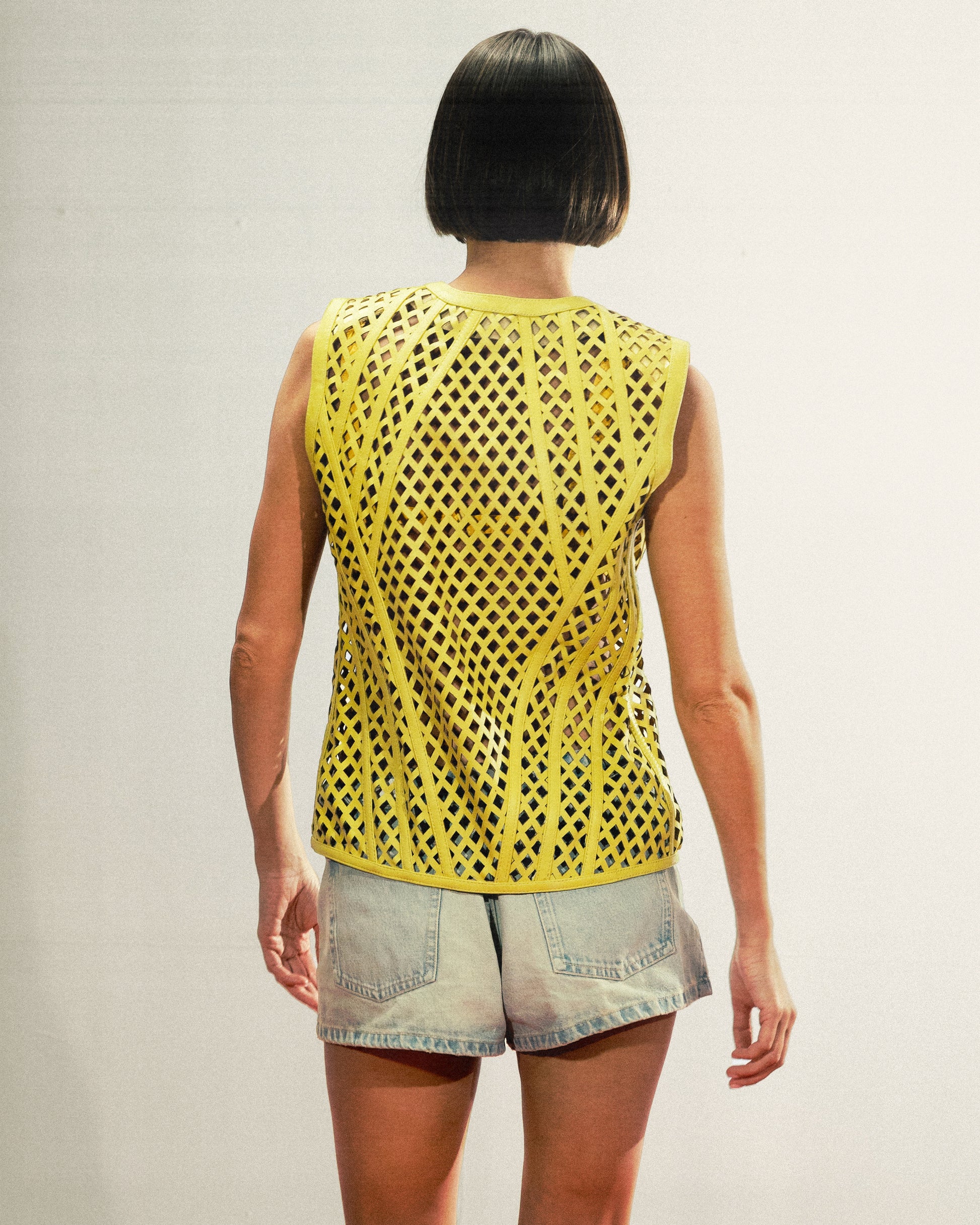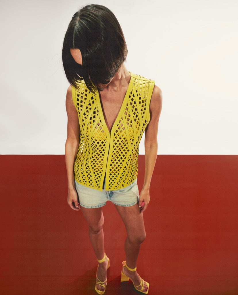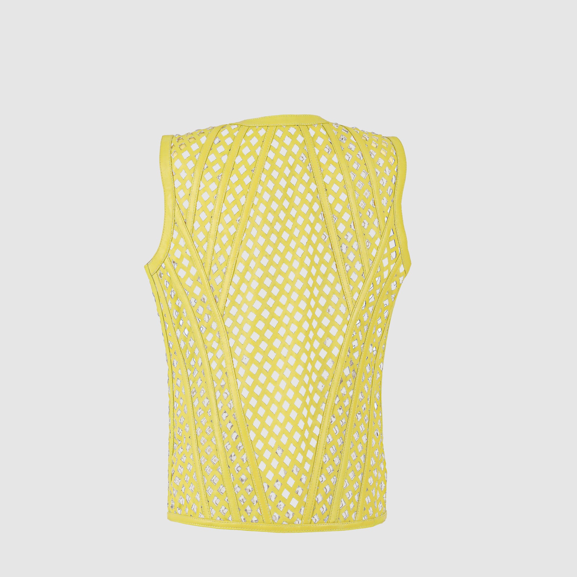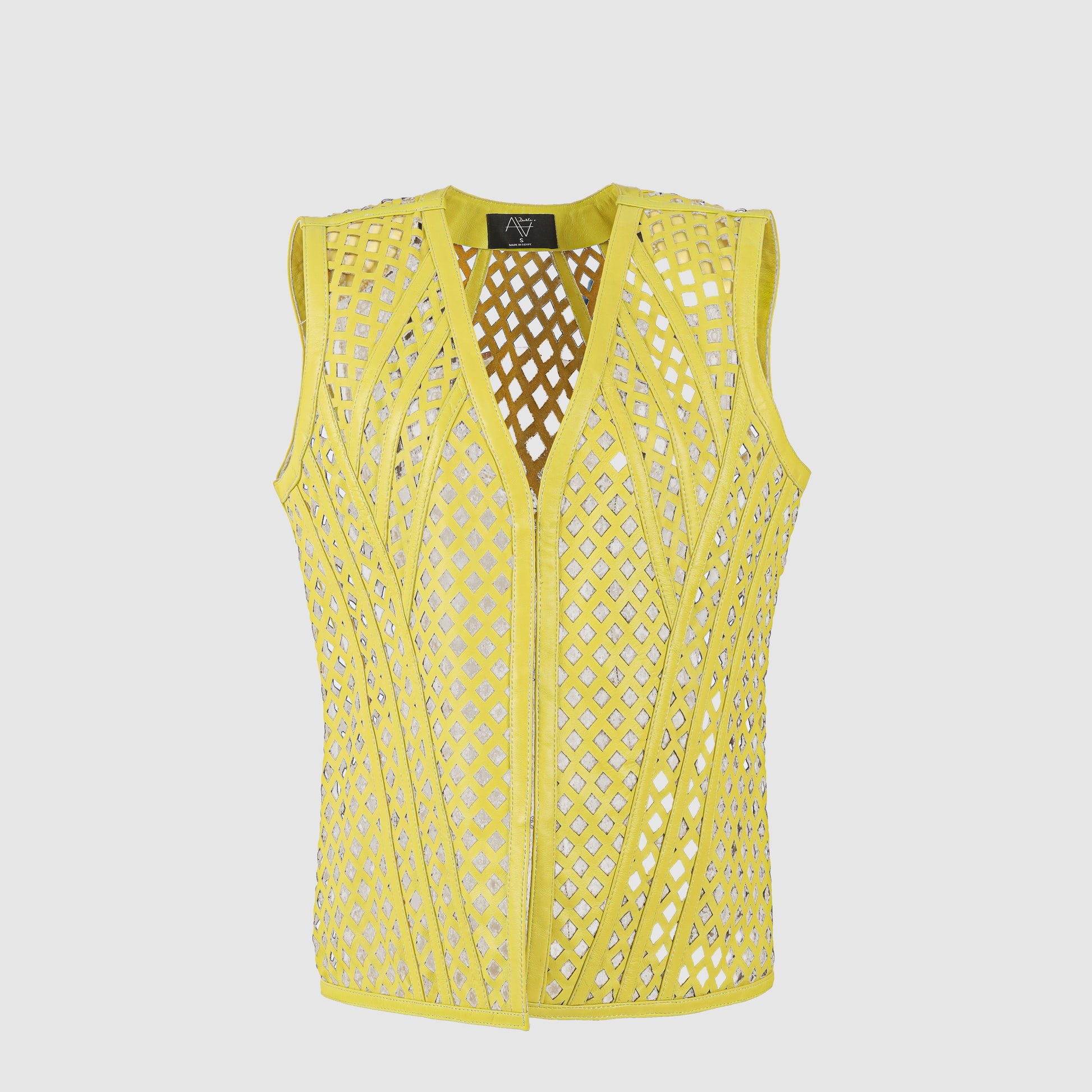 The Aurelia Leather vest is a piece that redefines the classic leather vest with a contemporary twist that is sure to turn heads. It features laser cut details and two front hook closure.
