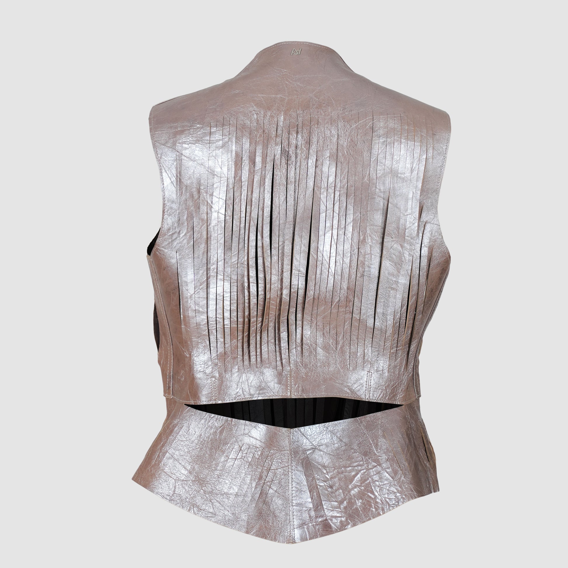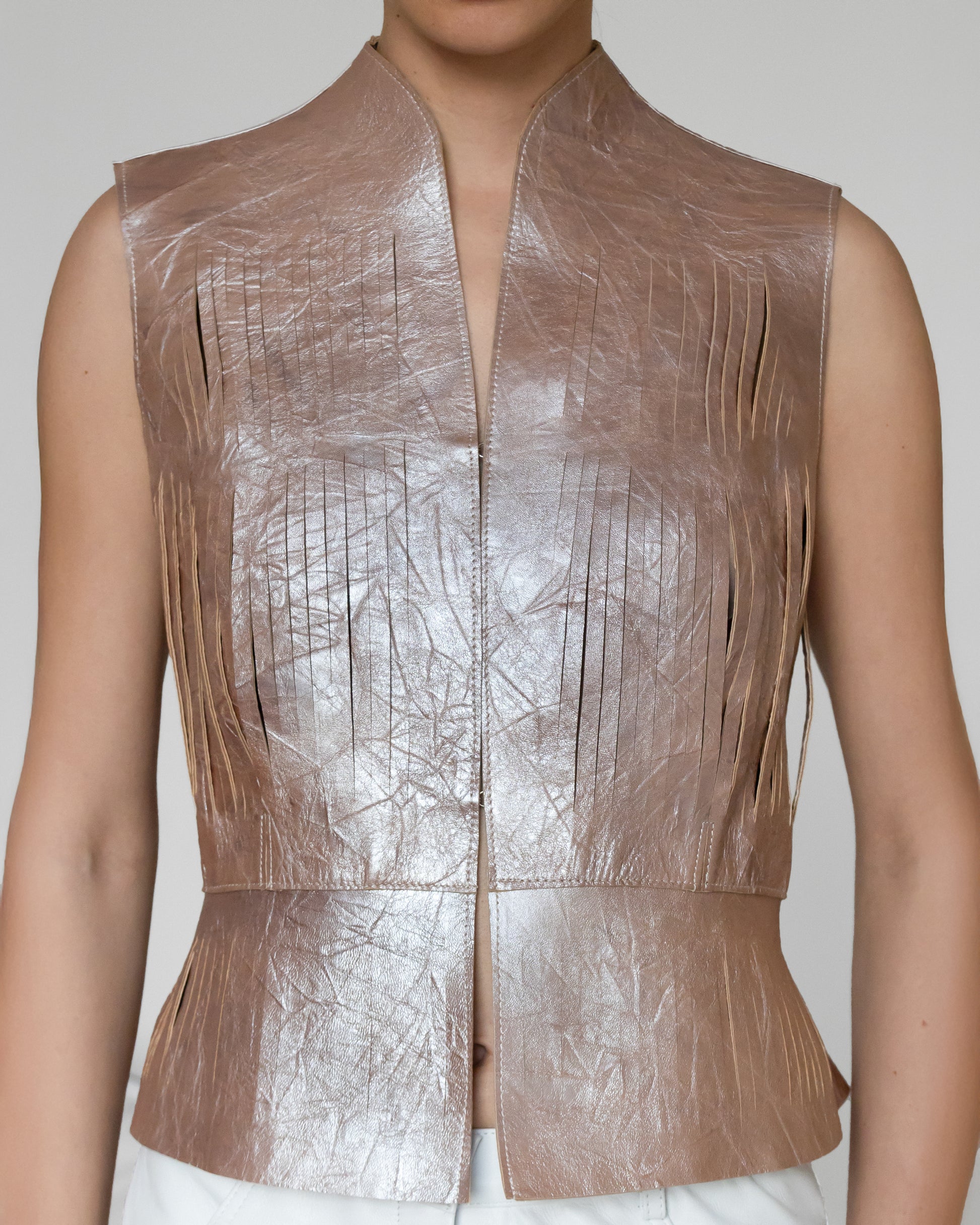 The Ayla II leather vest is where bold design meets effortless movement. Featuring dynamic fringes for a striking edge, a defined waistline detail for a flattering fit, and a unique back opening that adds dimension, this piece is designed to stand out. The front metal hook closure offers a sleek finish, making it a versatile layering essential with a statement twist.