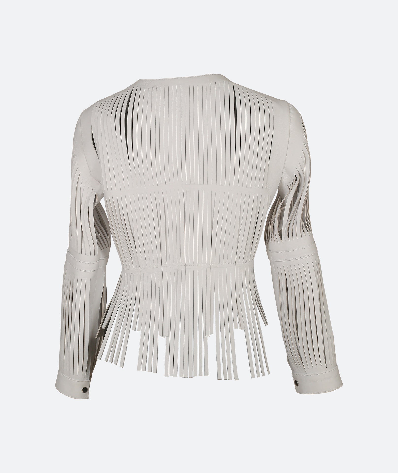 The Ayla jacket is a double layered leather fringed Jacket with long sleeves, featuring metal hook fastening at the front. It is a must have statement piece that will definitely turn heads.