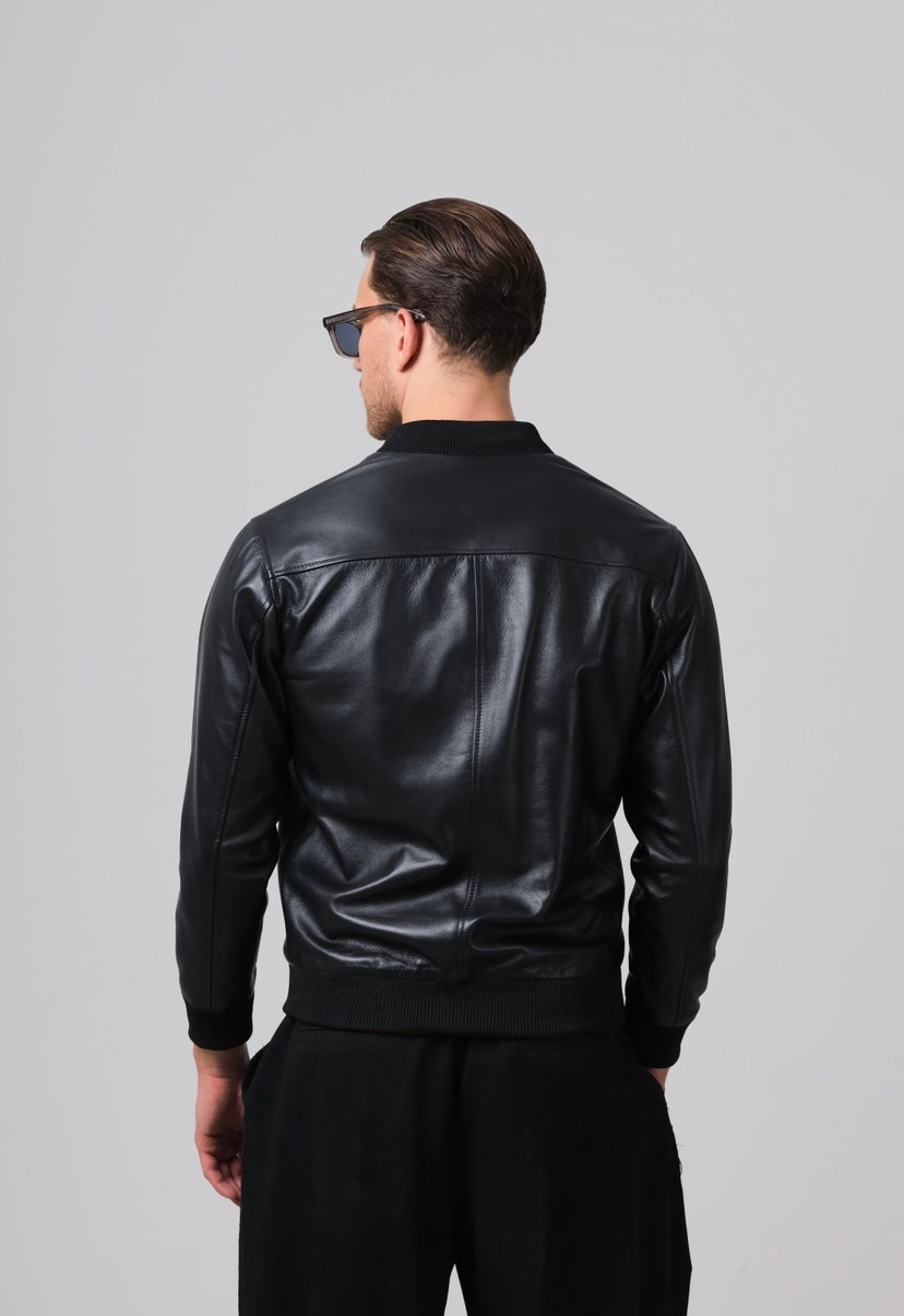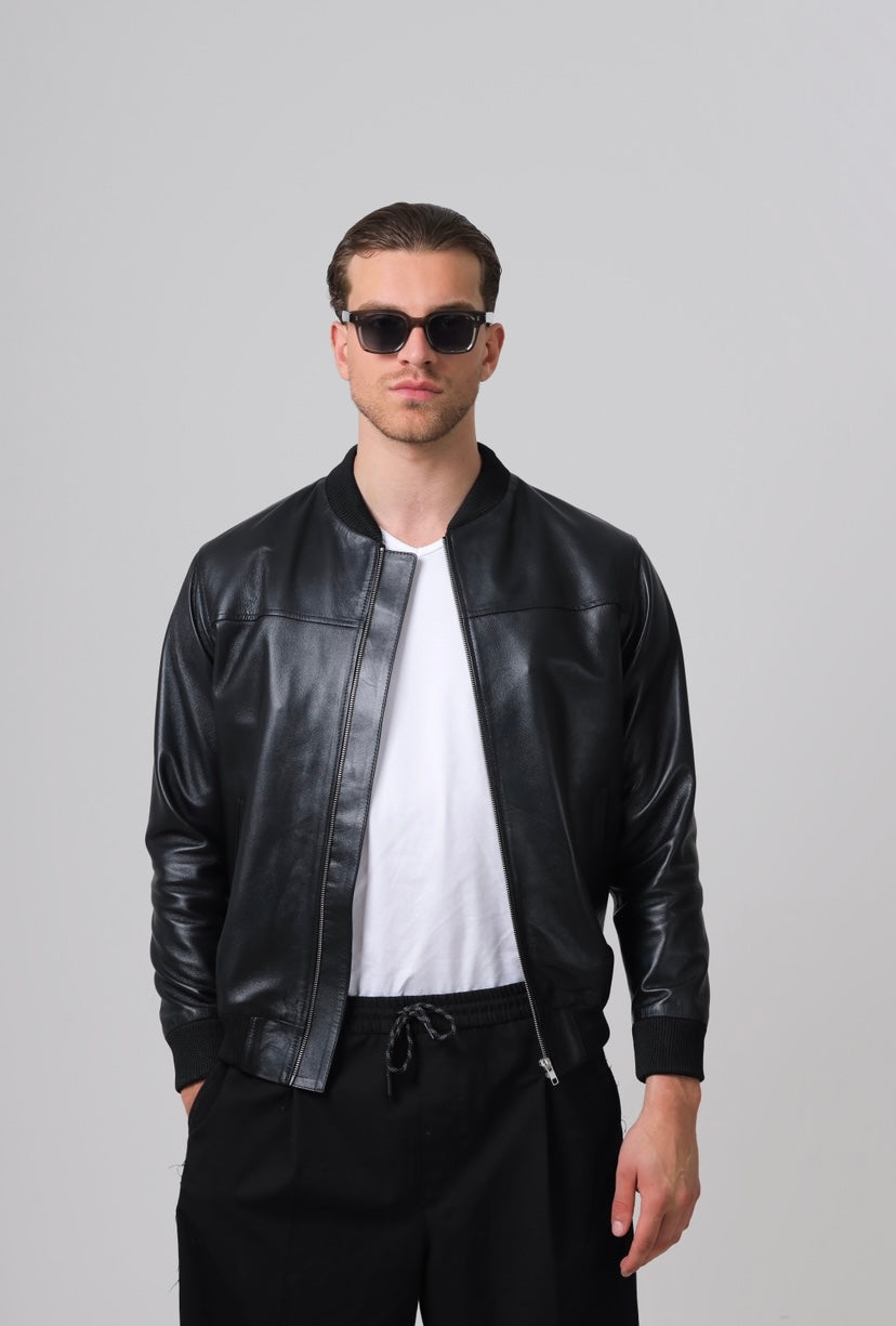 The Bailey is a genderless leather jacket, it features welt pockets, interior pocket detail, ribbed hem, and front zip fastening.