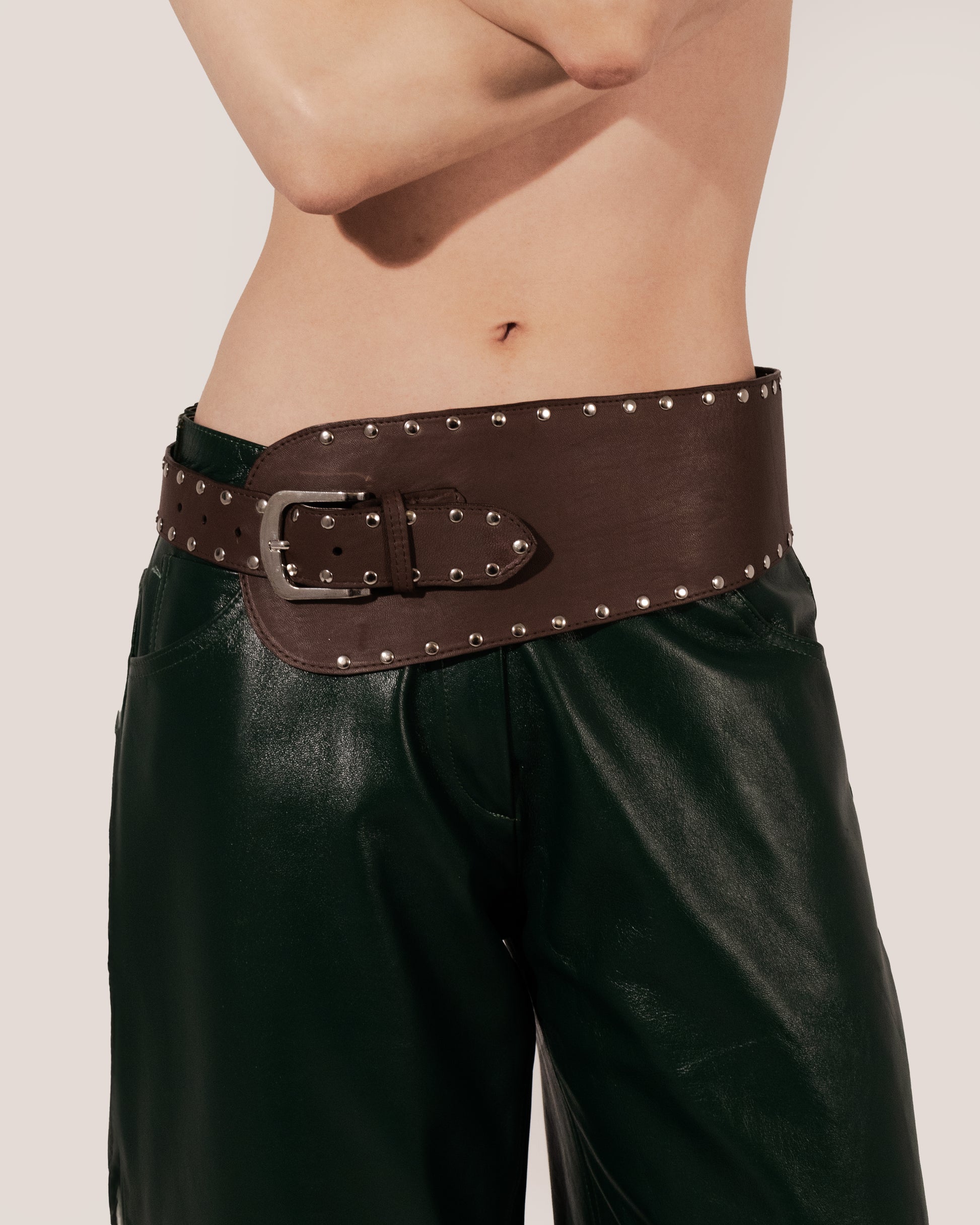 Make a bold style statement with our leather waist belt, designed with a unique combination of half thin and half wider straps for a striking, asymmetrical look. Adorned with metal studs, this belt adds an edgy flair to any outfit. Crafted from premium leather, it offers a perfect balance of modern design and durability. Ideal for cinching the waist and elevating dresses, coats, or tops, this belt is the ultimate accessory for those who love to stand out with style.