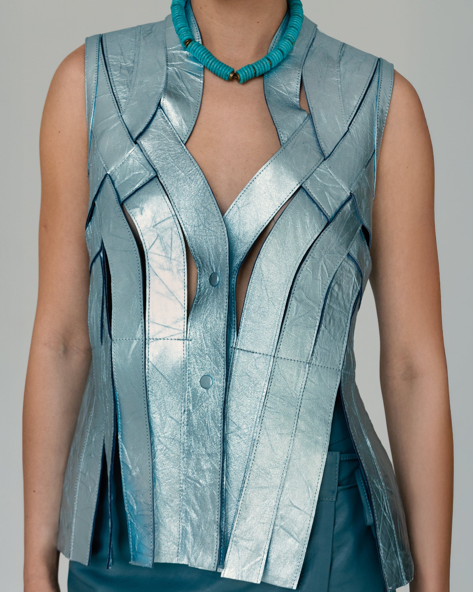 - Sleeveless leather vest featuring Β interlaced leather strapsΒ