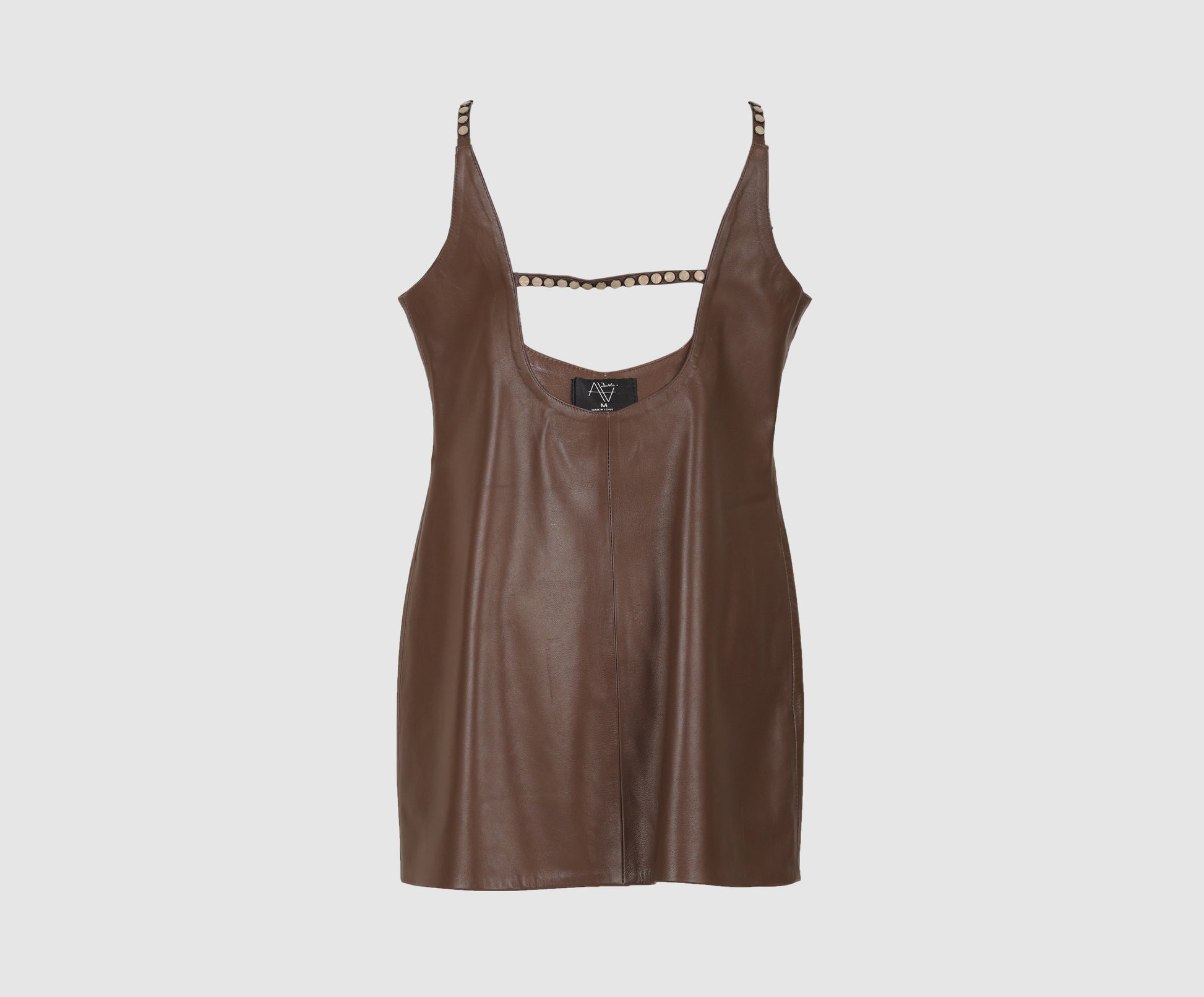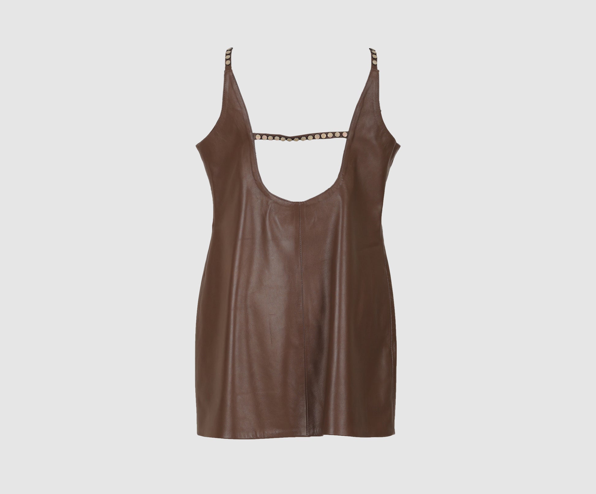 Introducing the Charlotte dress, when elegance meets cool! The Charlotte dress is an oversized leatherย dress, featuring a wide opening at the front and back with a studded leather strap, and studded shoulder straps. Style it on a shirt or a basic monochromatic pullover and a high knee boots for extra glamour and cool look.ย