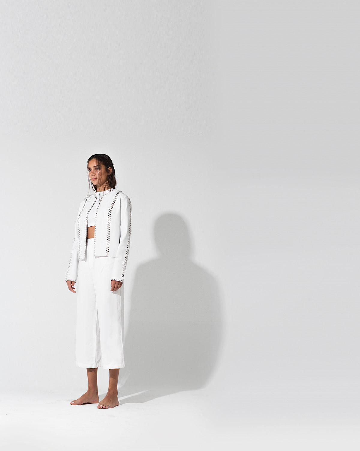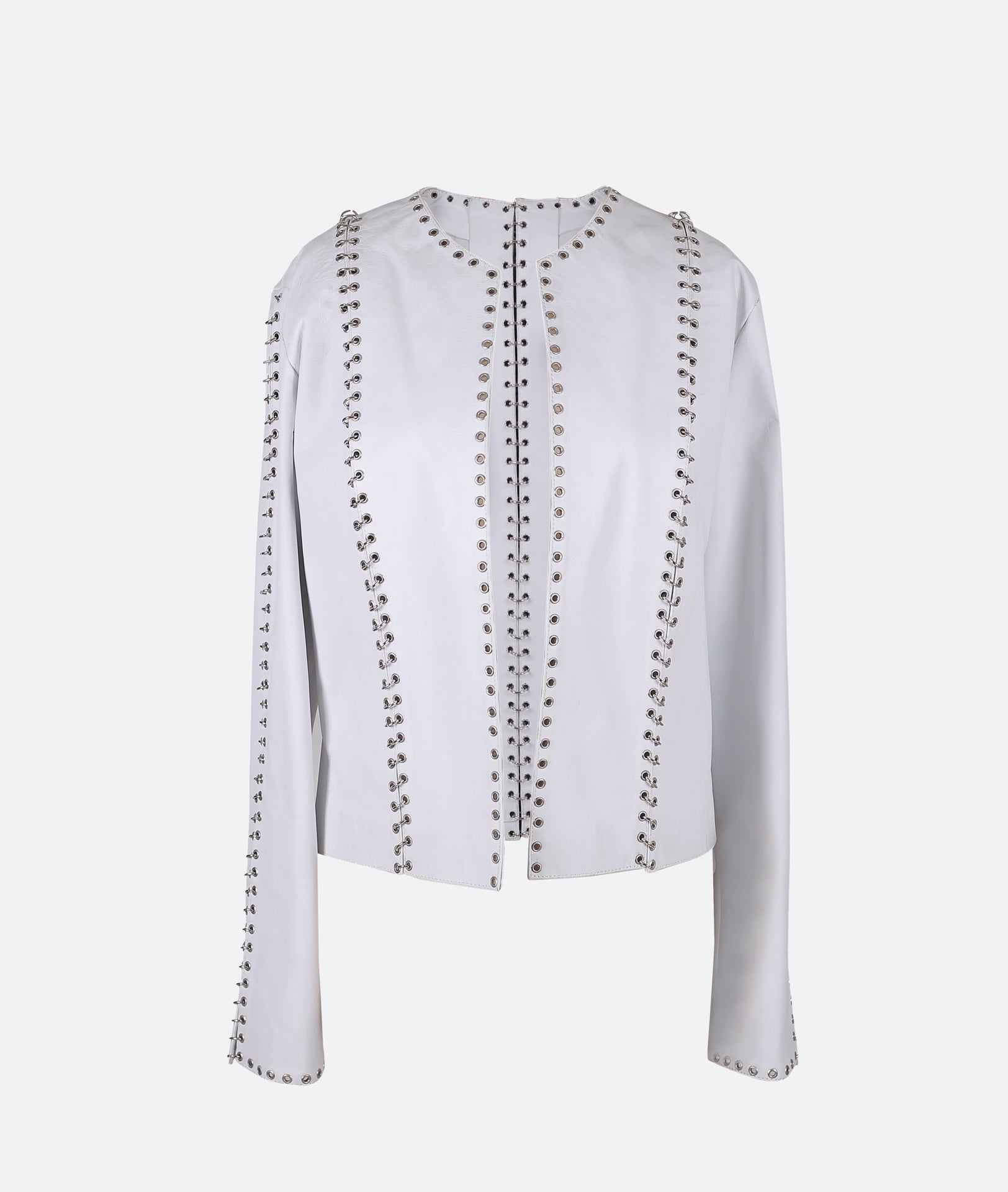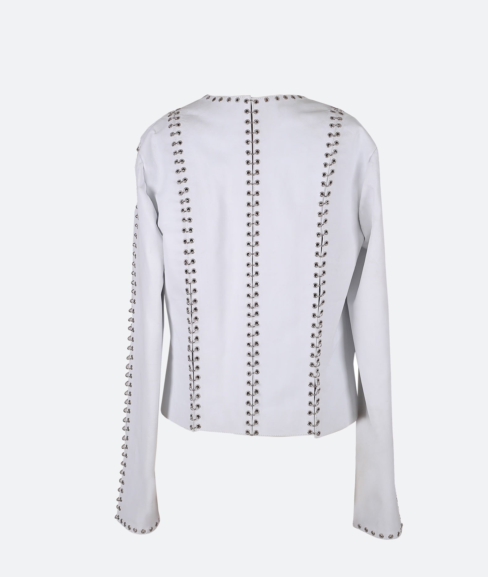 The chrome jacket is a round neck jacket with long sleeves featuring silver rings and eyelets that hold up the entire jacket and makes a turning head piece.