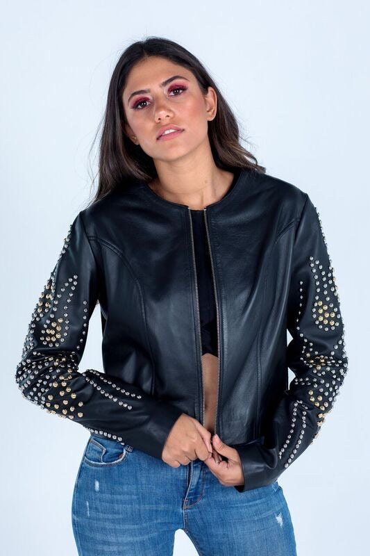 The clair de lune leather jacket is one of Double Aβs very first creations and still on our best sellers list. It is a leather Jacket with round-neckline and metal zip fastening at the front, featuring silver and light gold studs on the sleeves and fringes at the back.
