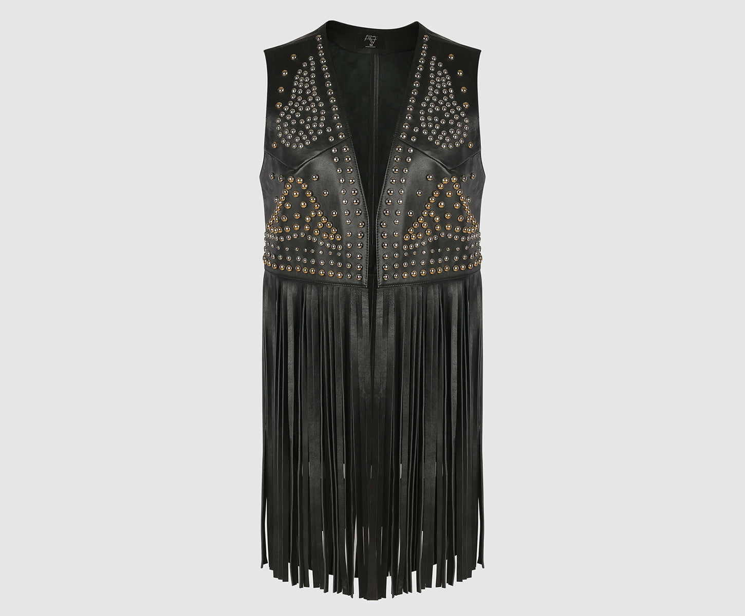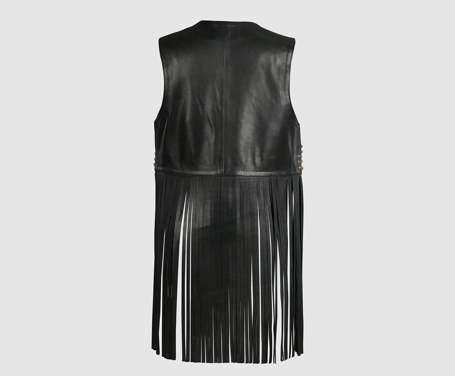 Meet one of Double Aβs signatures, the clair de lune vest, with its mix of silver and light gold studs it will make the spotlights on. It is a straight fit leather vest featuring fringes all around the hem. The clair de lune is a Double Aβs must have!