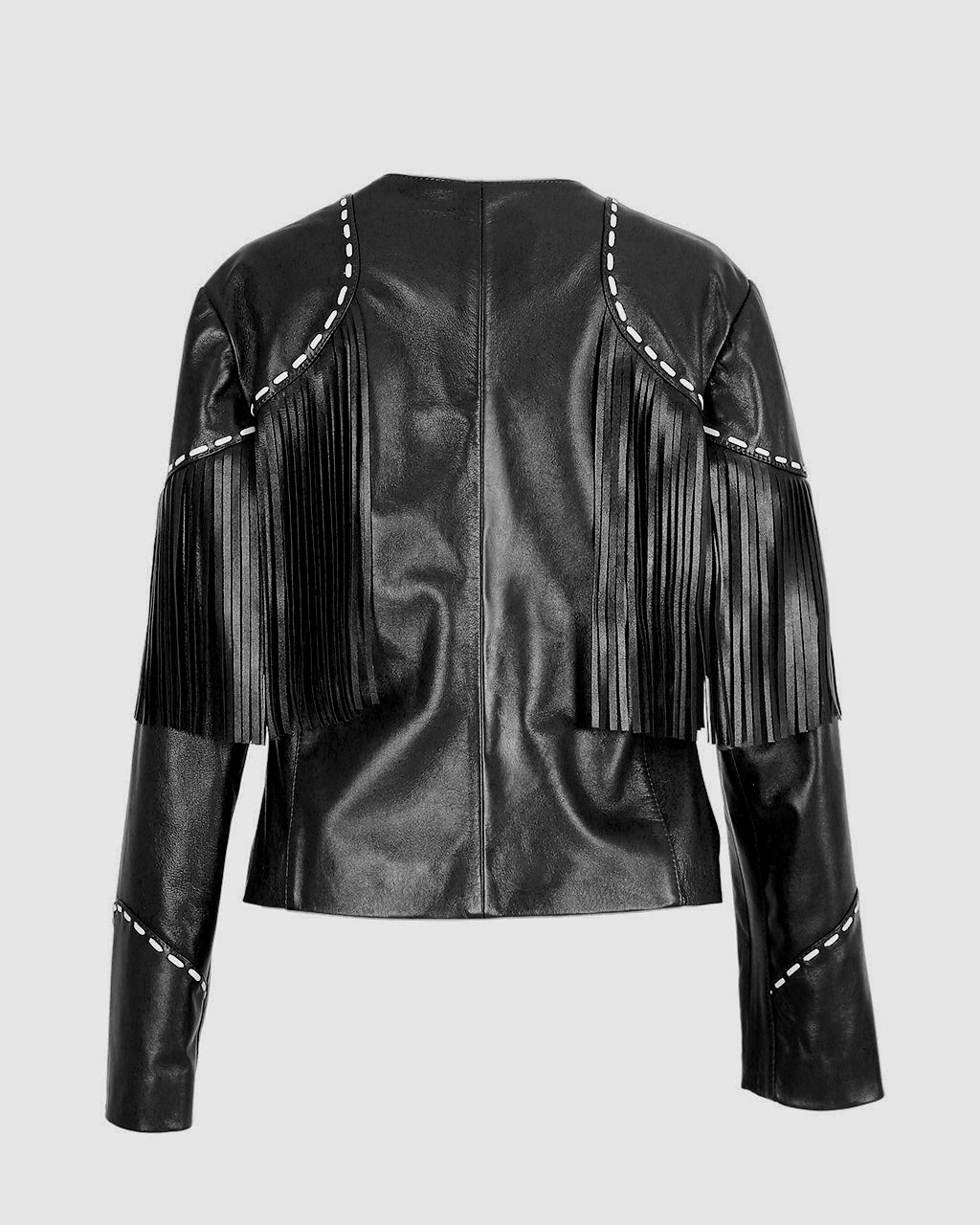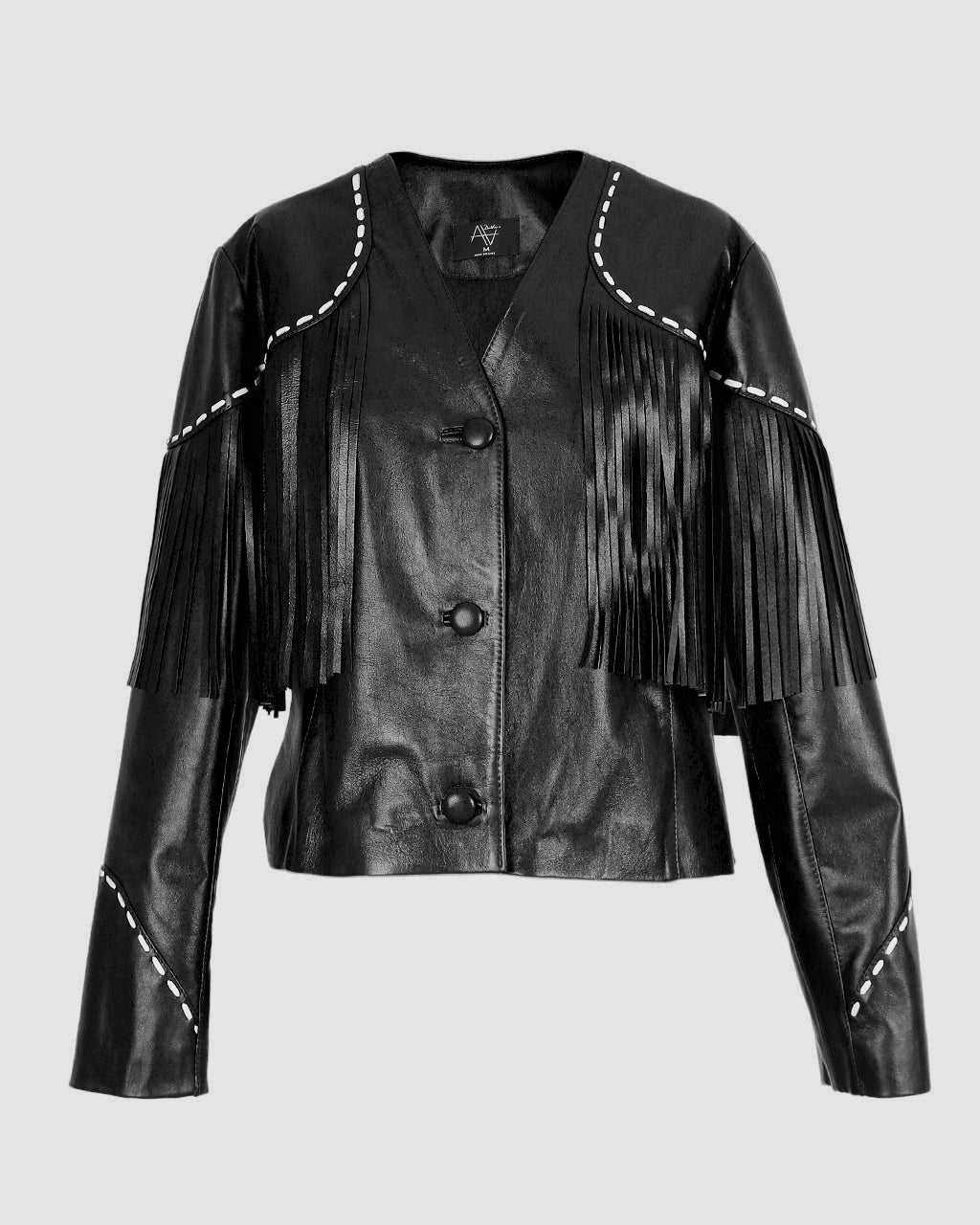 The Dalida leather jacket is finished in luxurious leather featuring fringes on the front and back with white hand stitched white leather rope. Style it on a jeans or dress.