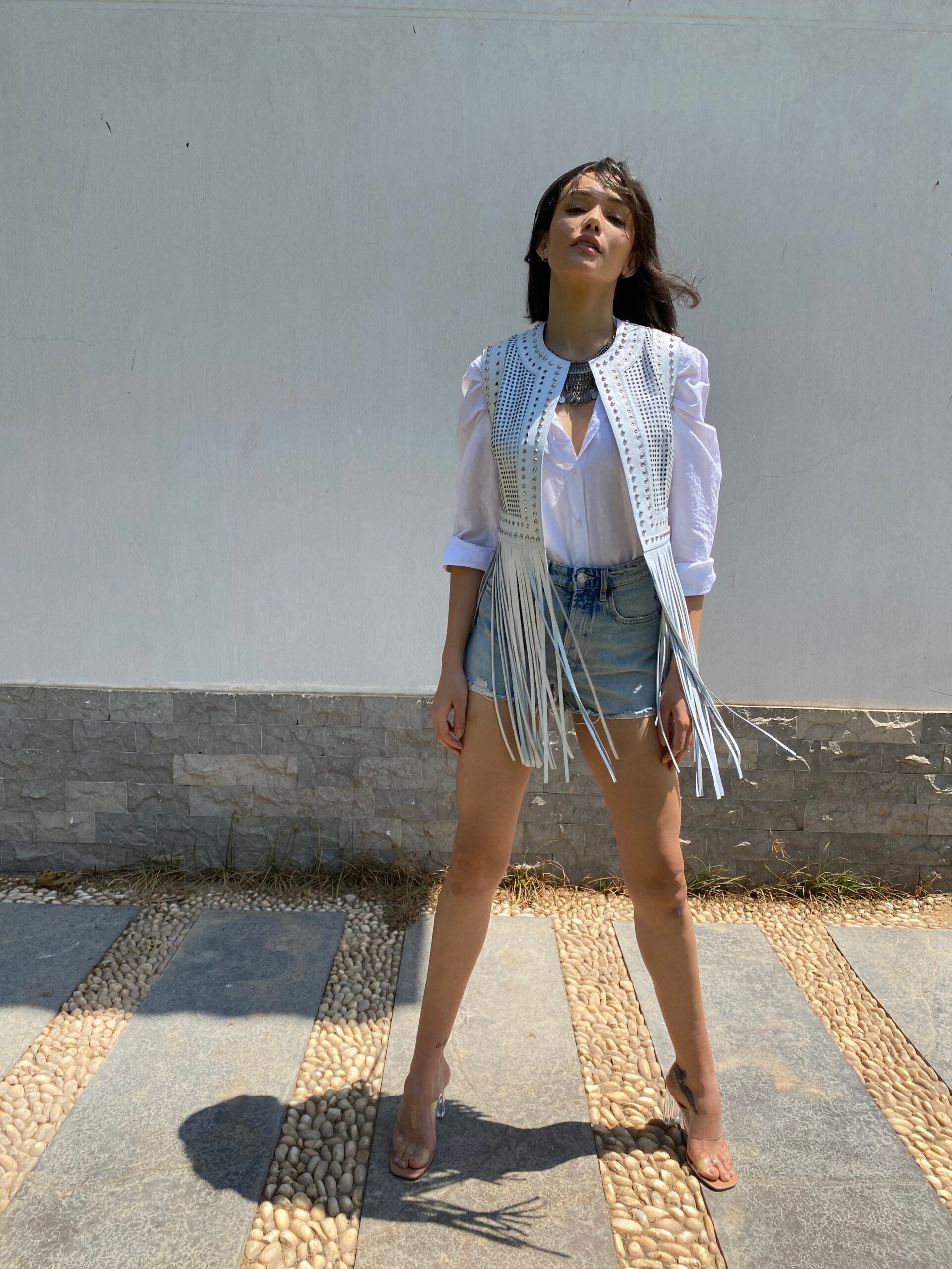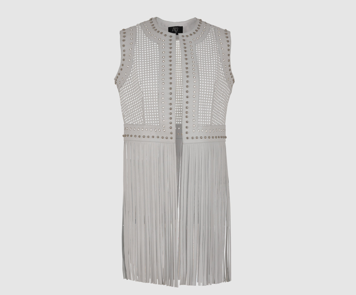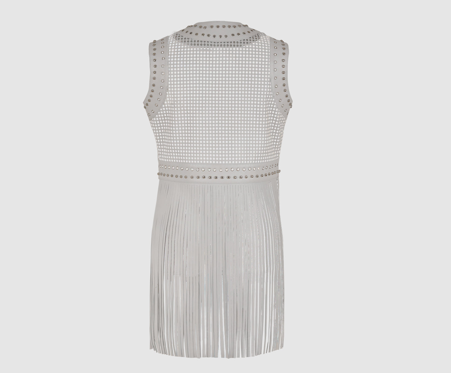 The Ebony studded vest is one of the Ebony family. Itβs a straight fit leather vest with laser cuts details on the front and back and studs and eyelets all over the front edges of the vest, it also features long fringes at the hem.
