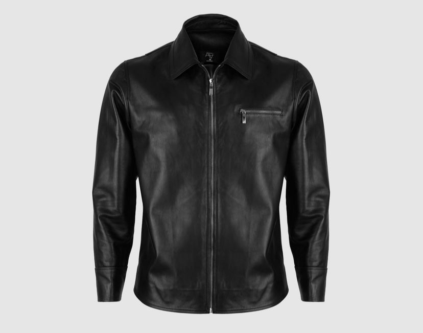 The Emerson is a genderless leather jacket, it features lapel collar, zip pockets on the chest and front zip fastening.