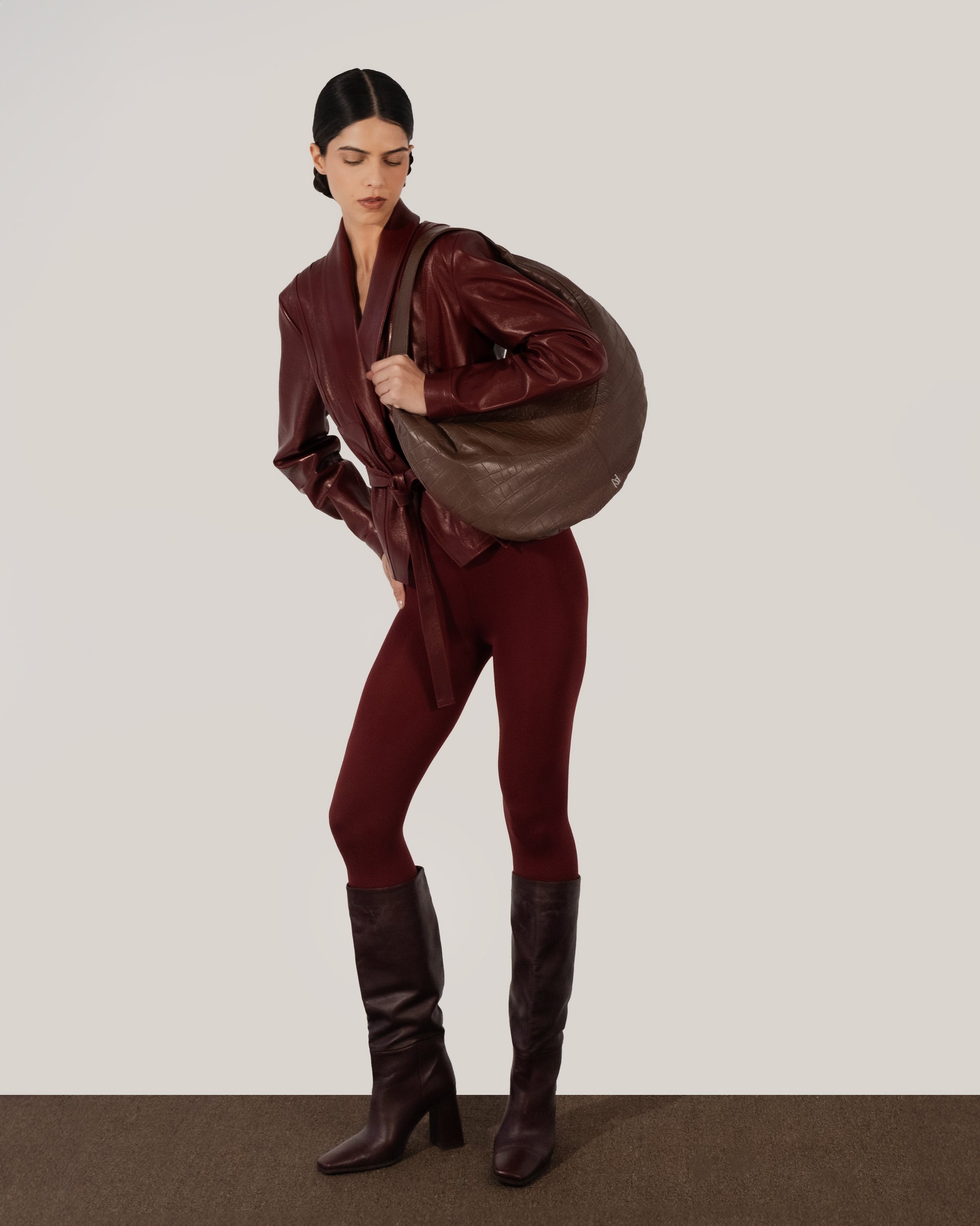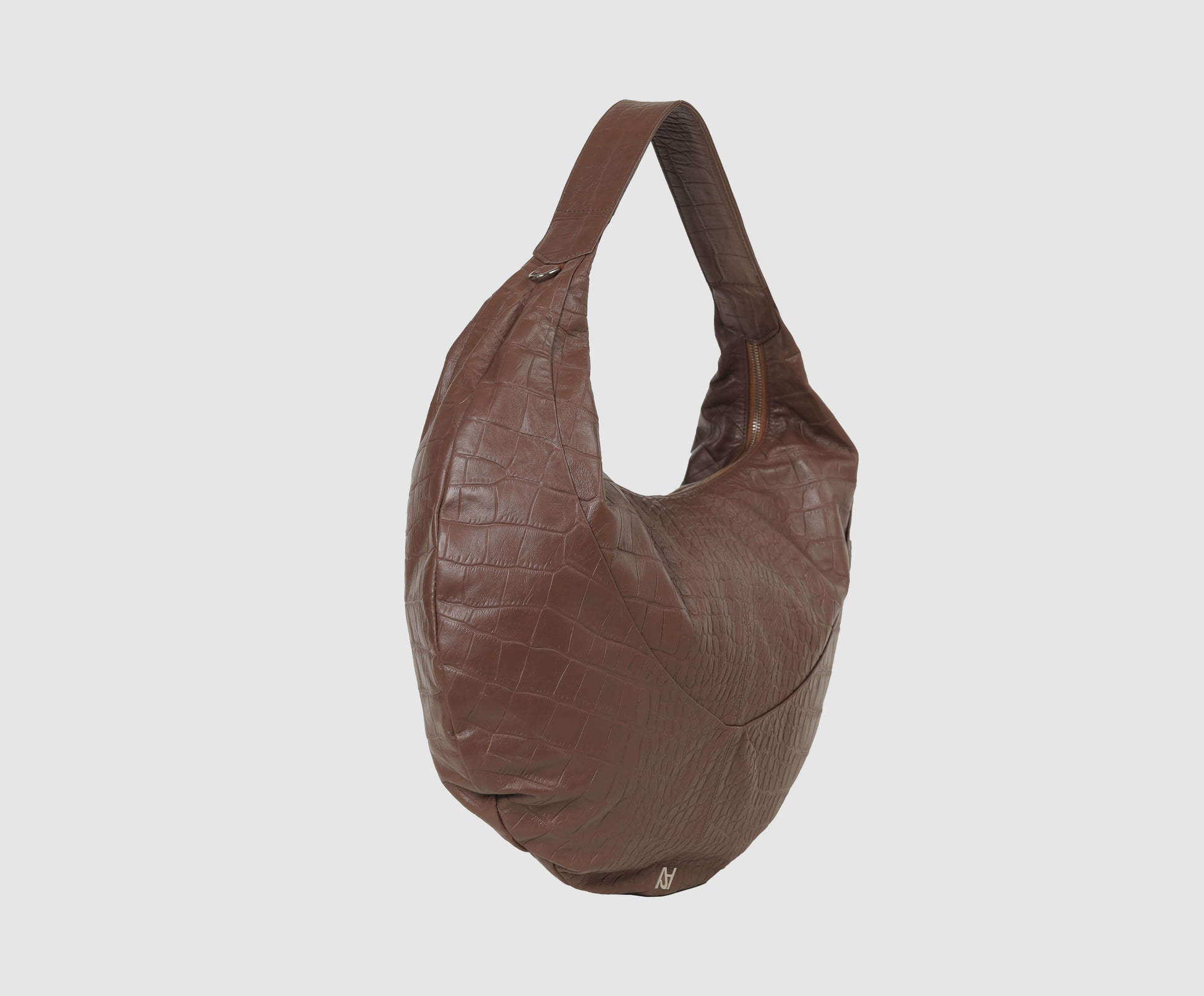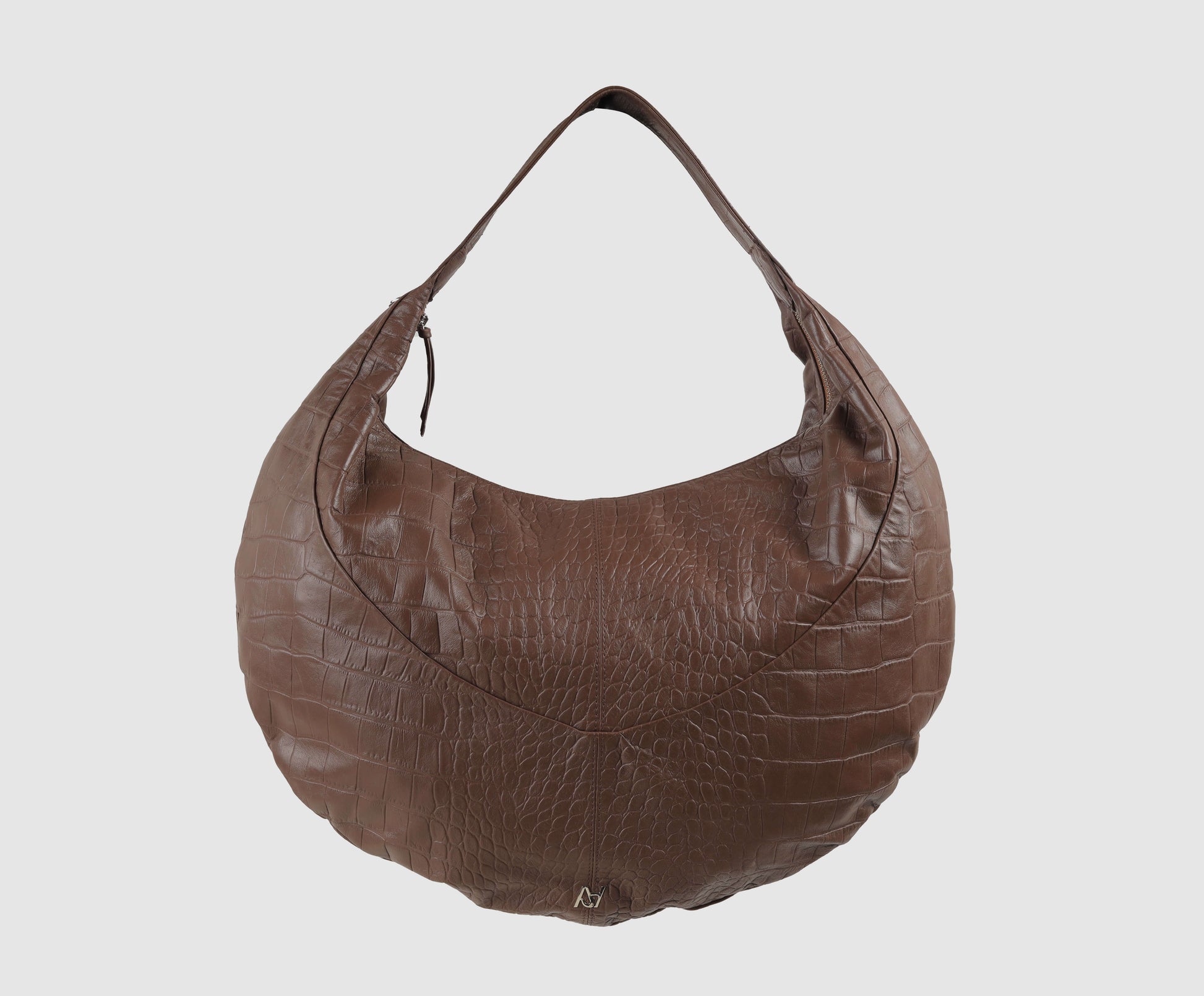 Make a bold statement with our oversized circular leather bag, crafted from luxurious croc-embossed leather. The unique round shape and zip closure offer a modern twist on a classic silhouette, combining style with functionality. Spacious enough to hold all your essentials, this bag is both practical and eye-catching. Perfect for those who love standout accessories, the croc texture adds a touch of sophistication to this must-have piece.