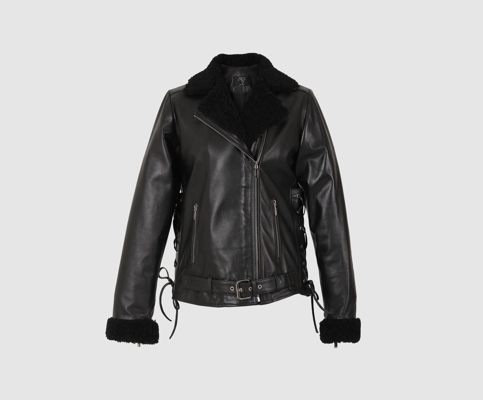 Material 1: 100% Merino Shearling;Β Material 2:Β 80% Polyester; 20% Satin - Over-sized biker jacket