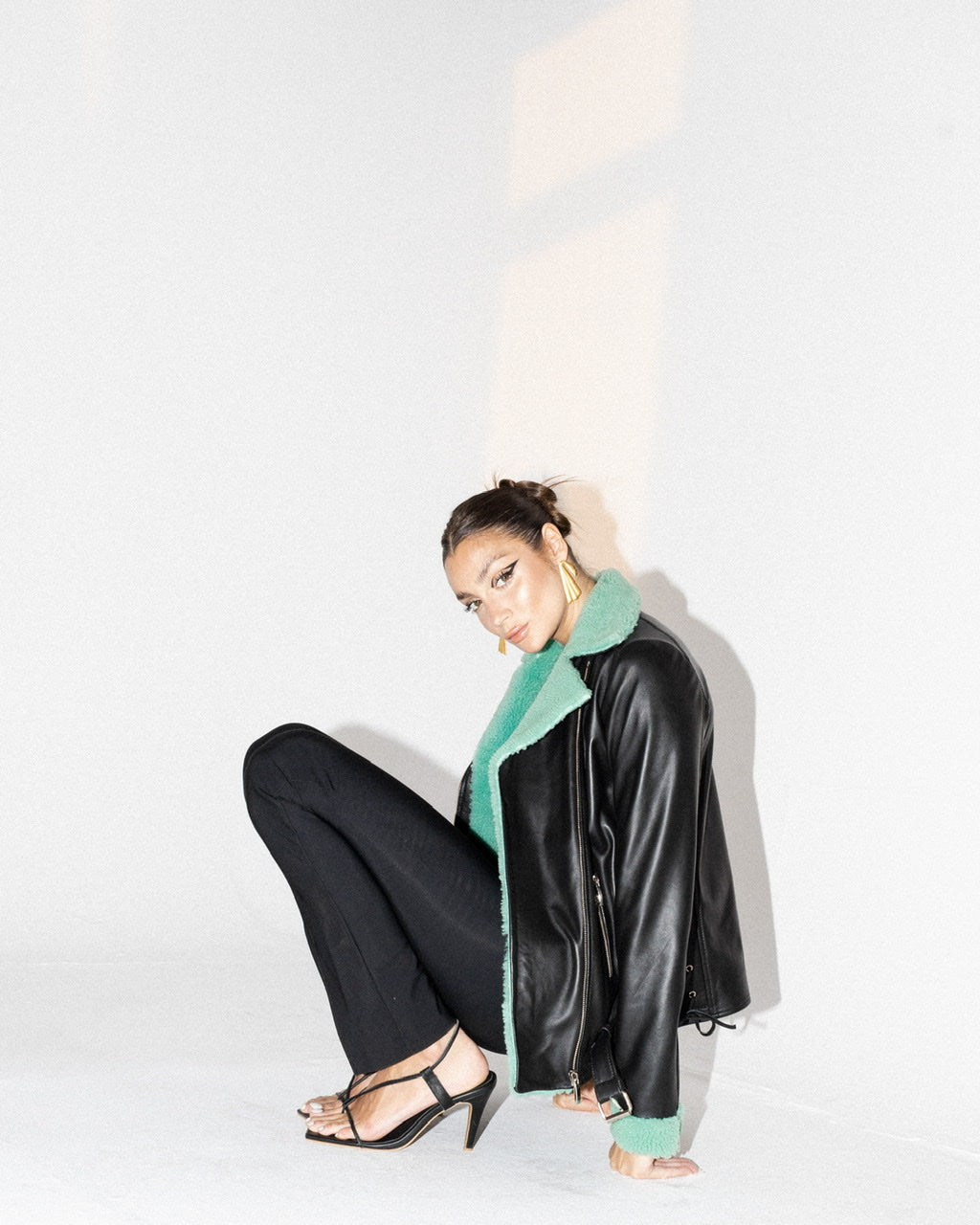 Material 1: 100% Merino Shearling;Β Material 2:Β 80% Polyester; 20% Satin - Over-sized biker jacket