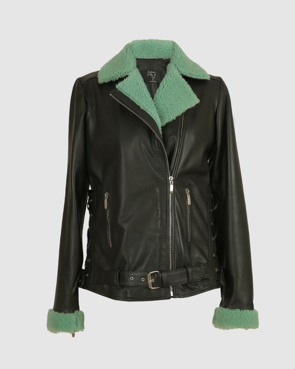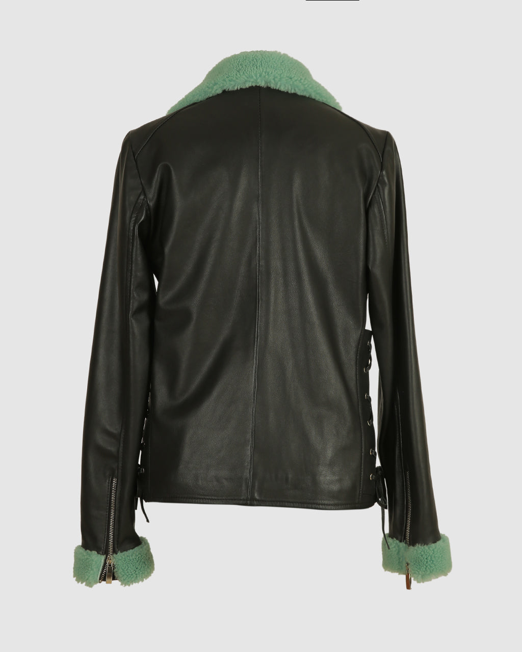 The GaiaΒ shearling leather jacket is a must have piece with its pop green shearling it will definitely turn heads. It is finished in a luxurious soft leather and shearling. The Gaia shearling jacket will definitely back you up in the cold/windy days. It features front pockets with a metal zip, Leather belt with a buckle and metal zip up fastening at the front. We recommend you style it on a jeans, joggers and a cool cap, or even a dress.