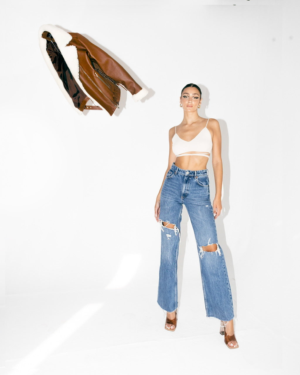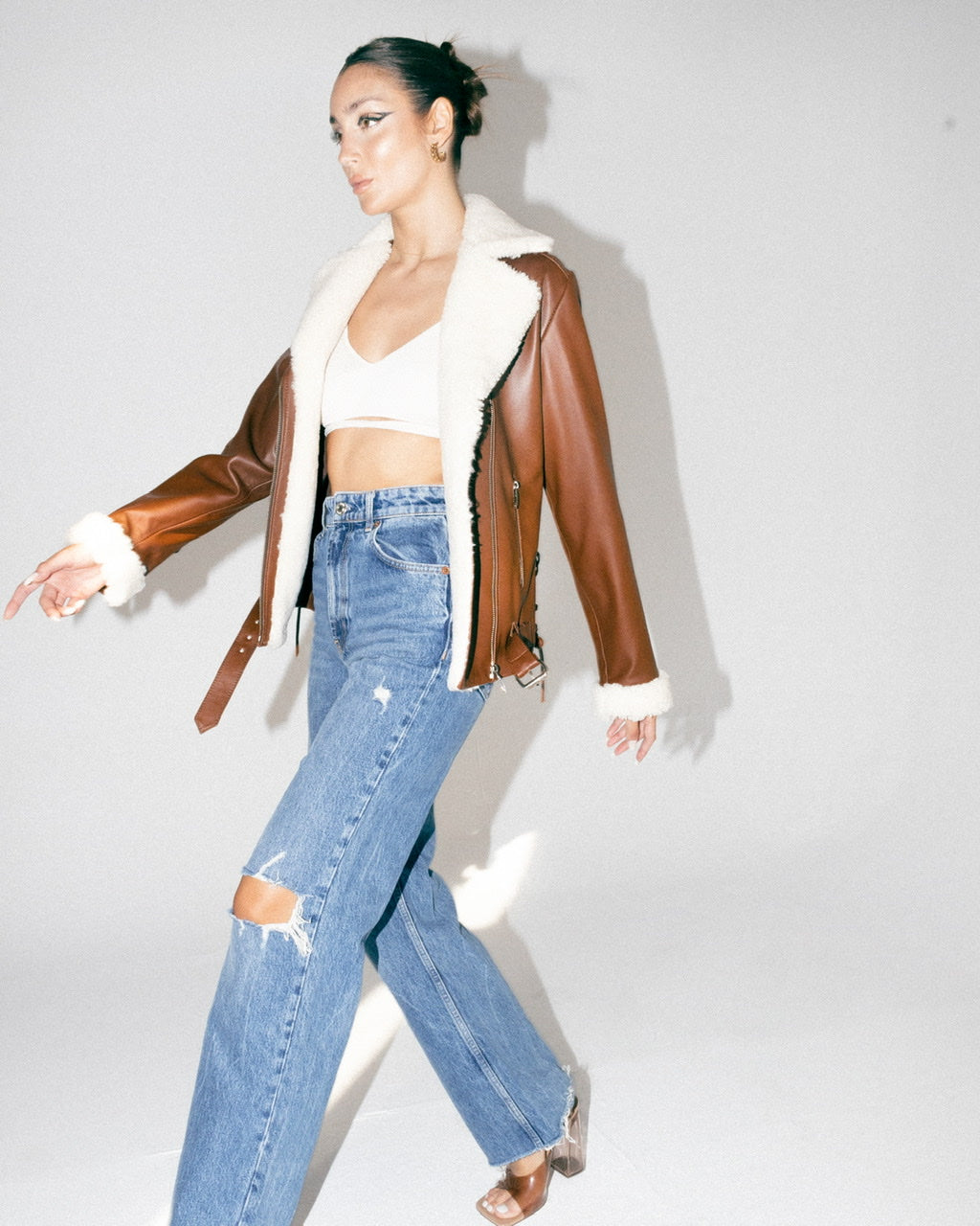 Material 1: 100% Merino Shearling;Β Material 2:Β 80% Polyester; 20% Satin - Over-sized biker jacket
