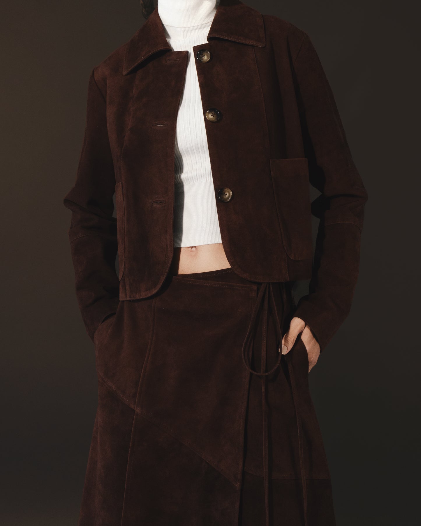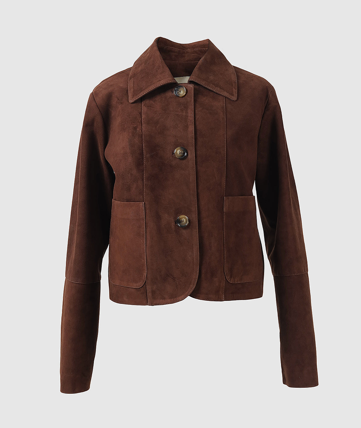 - Suede leather Jacket featuring a classic collar and two convenient pockets