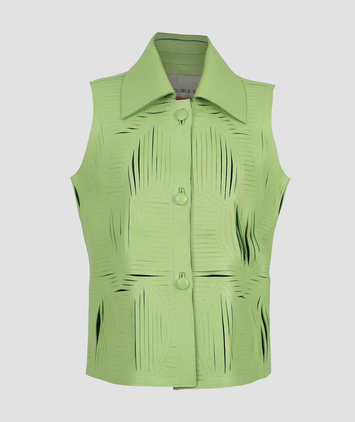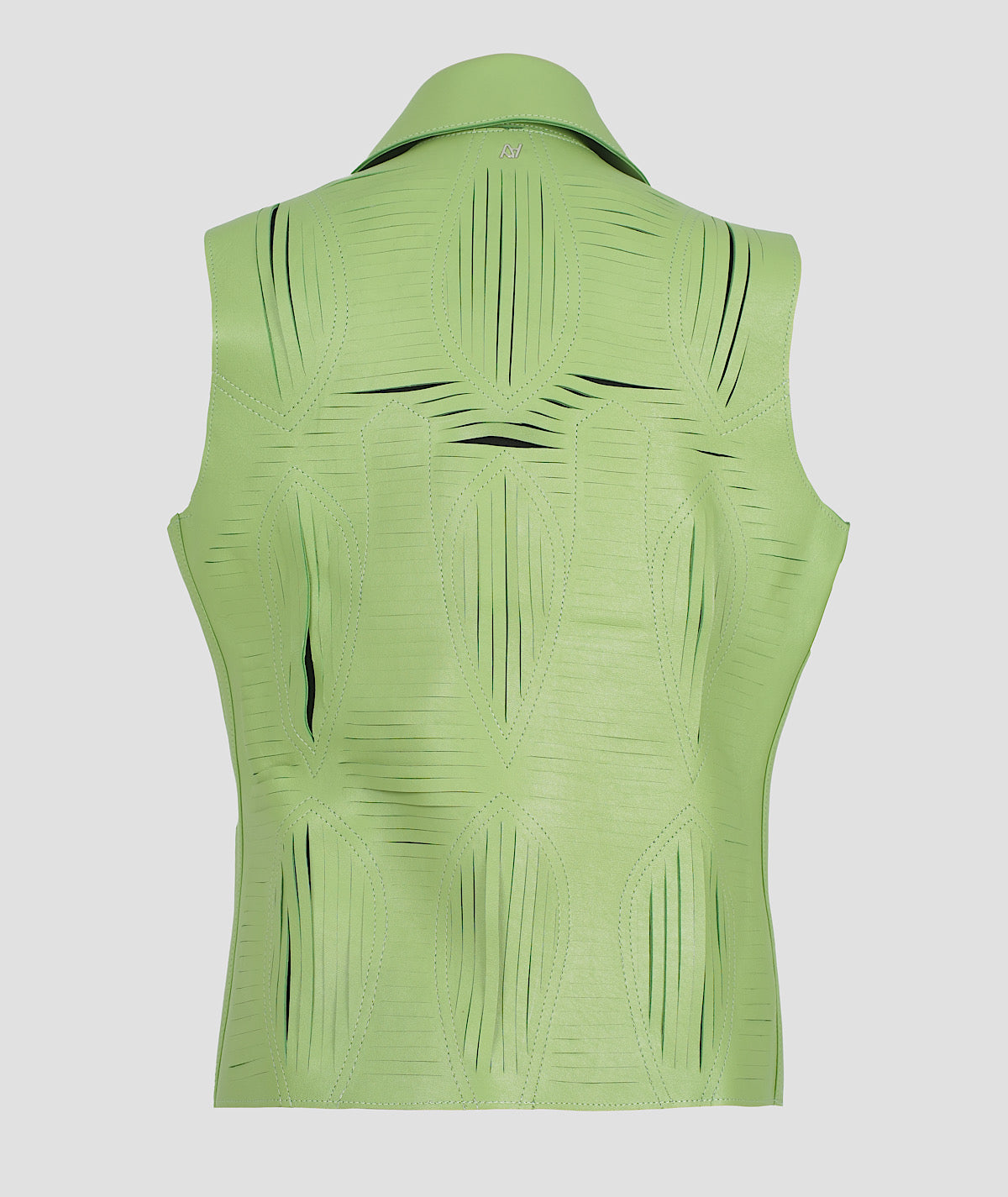 - Leather vest featuring shredded U-shaped detailing