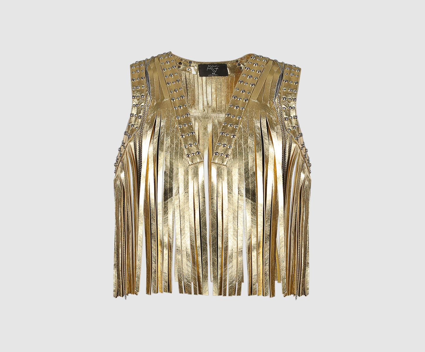 - Flowing fringed leather vest with studs and tiny chains details