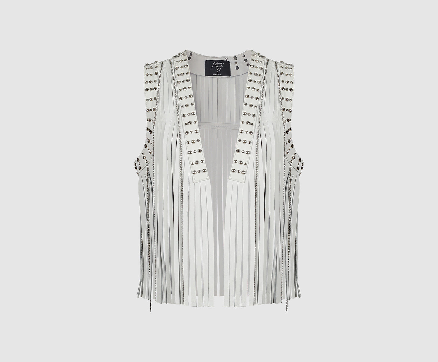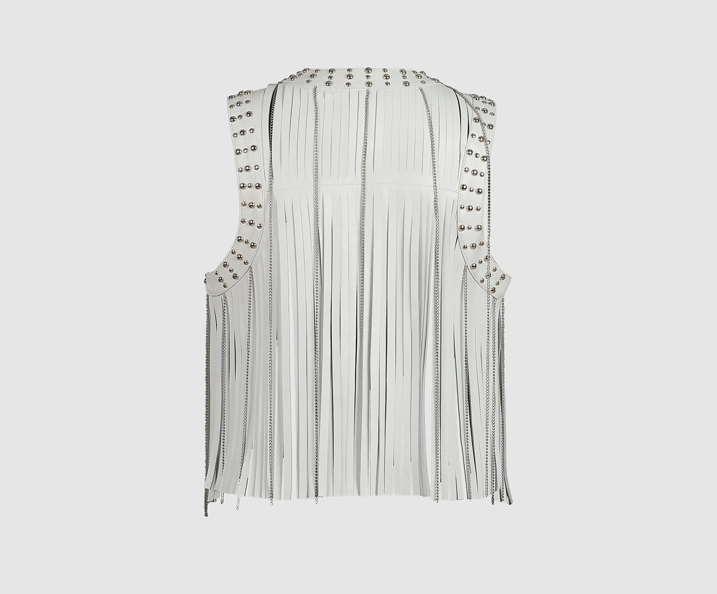- Flowing fringed leather vest with studs and tiny chains details