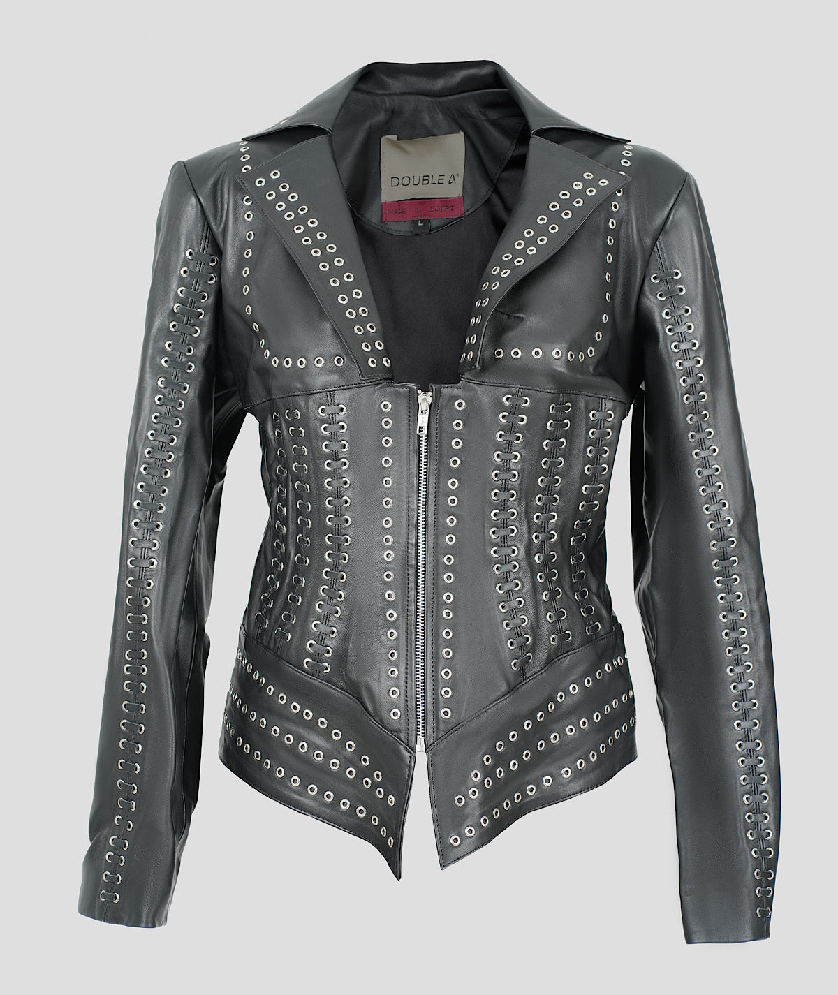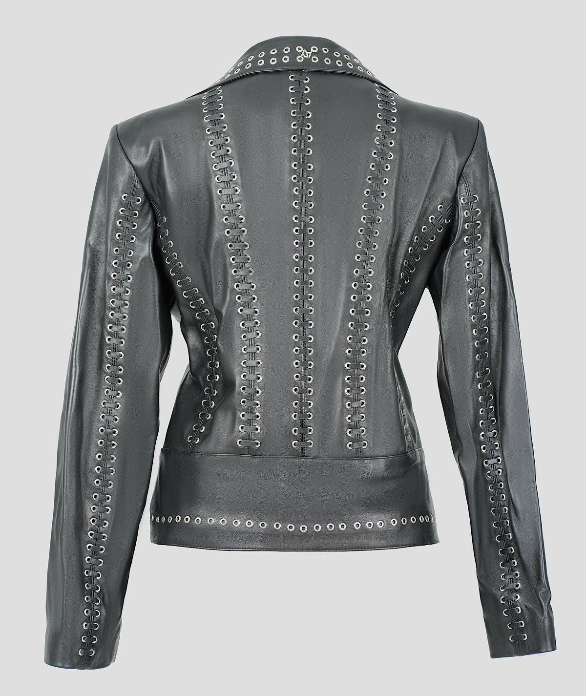 The Kayla is a striking leather jacket that merges structure with bold detailing. Designed with interlaced leather stripes featuring eyelets and threaded leather ropes, this piece creates a defined corset-like silhouette that enhances the bodyβs shape. The lapel collar adds a refined touch, while the front metal zipper closure provides a sleek finish. A statement piece on its own, this jacket is the perfect blend of edgy craftsmanship and timeless sophistication.