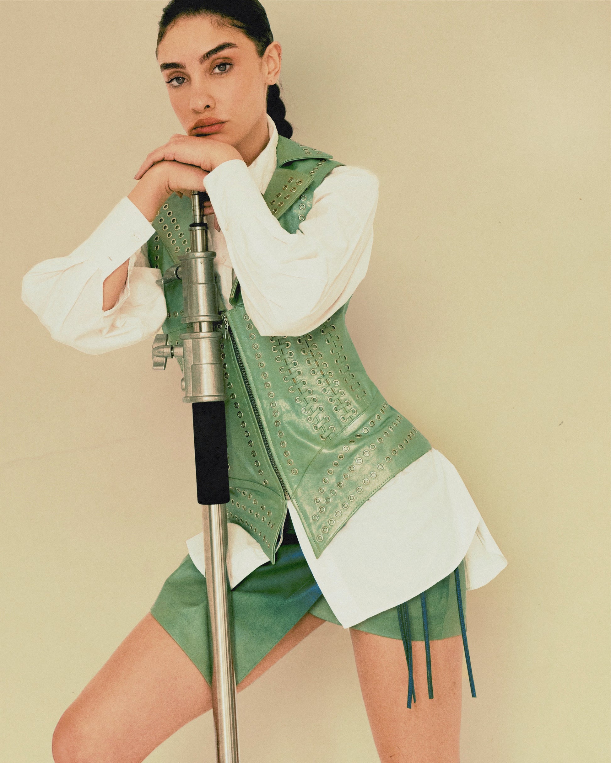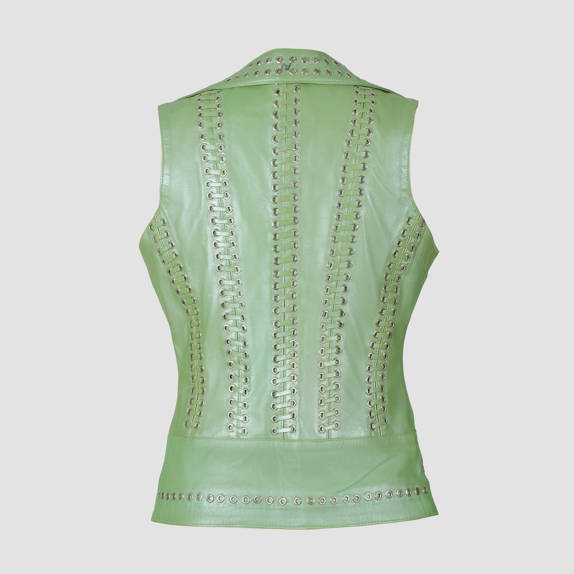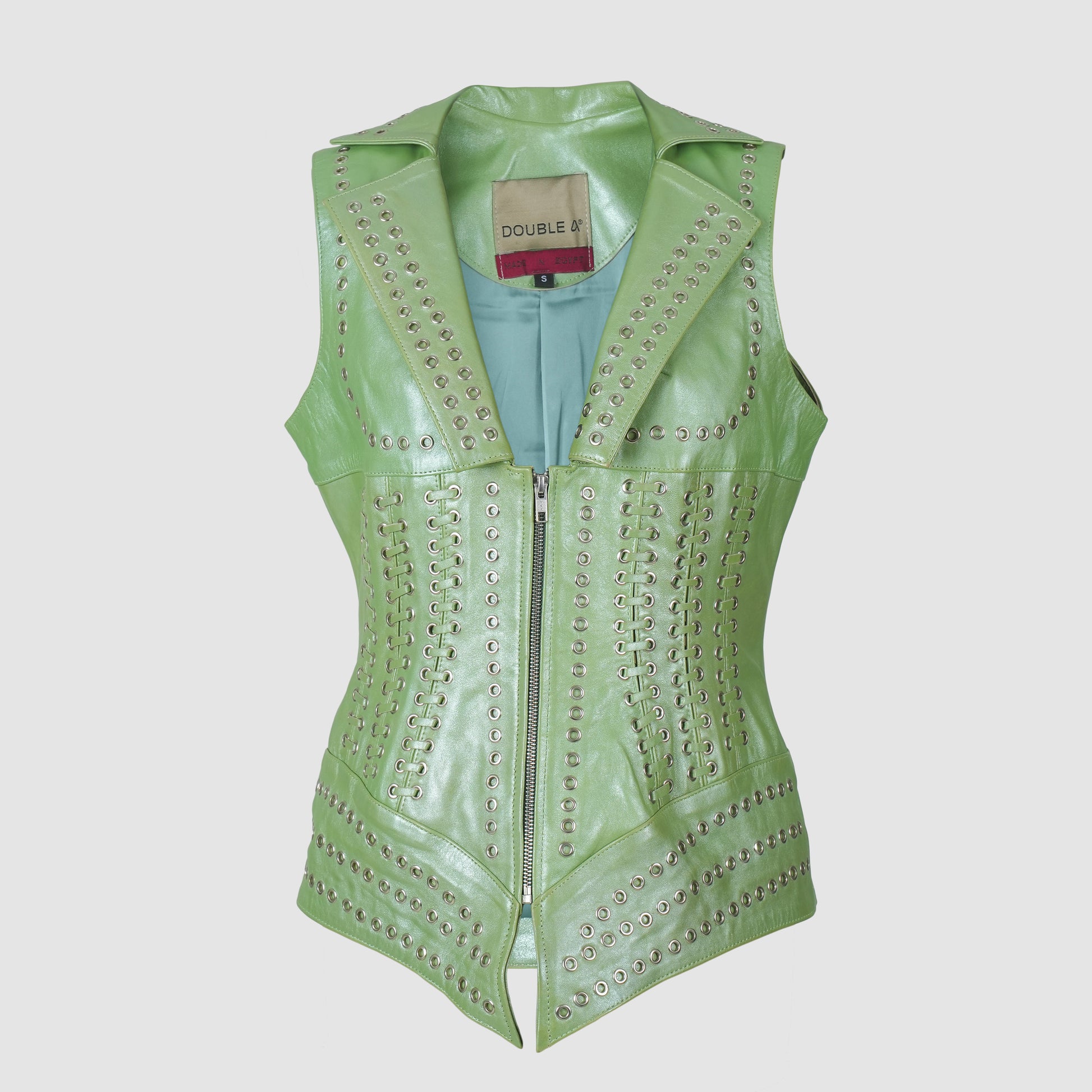 The Kayla is a striking leather vest that merges structure with bold detailing. Designed with interlaced leather stripes featuring eyelets and threaded leather ropes, this piece creates a defined corset-like silhouette that enhances the bodyβs shape. The lapel collar adds a refined touch, while the front metal zipper closure provides a sleek finish. A statement piece on its own, this vest is the perfect blend of edgy craftsmanship and timeless sophistication.