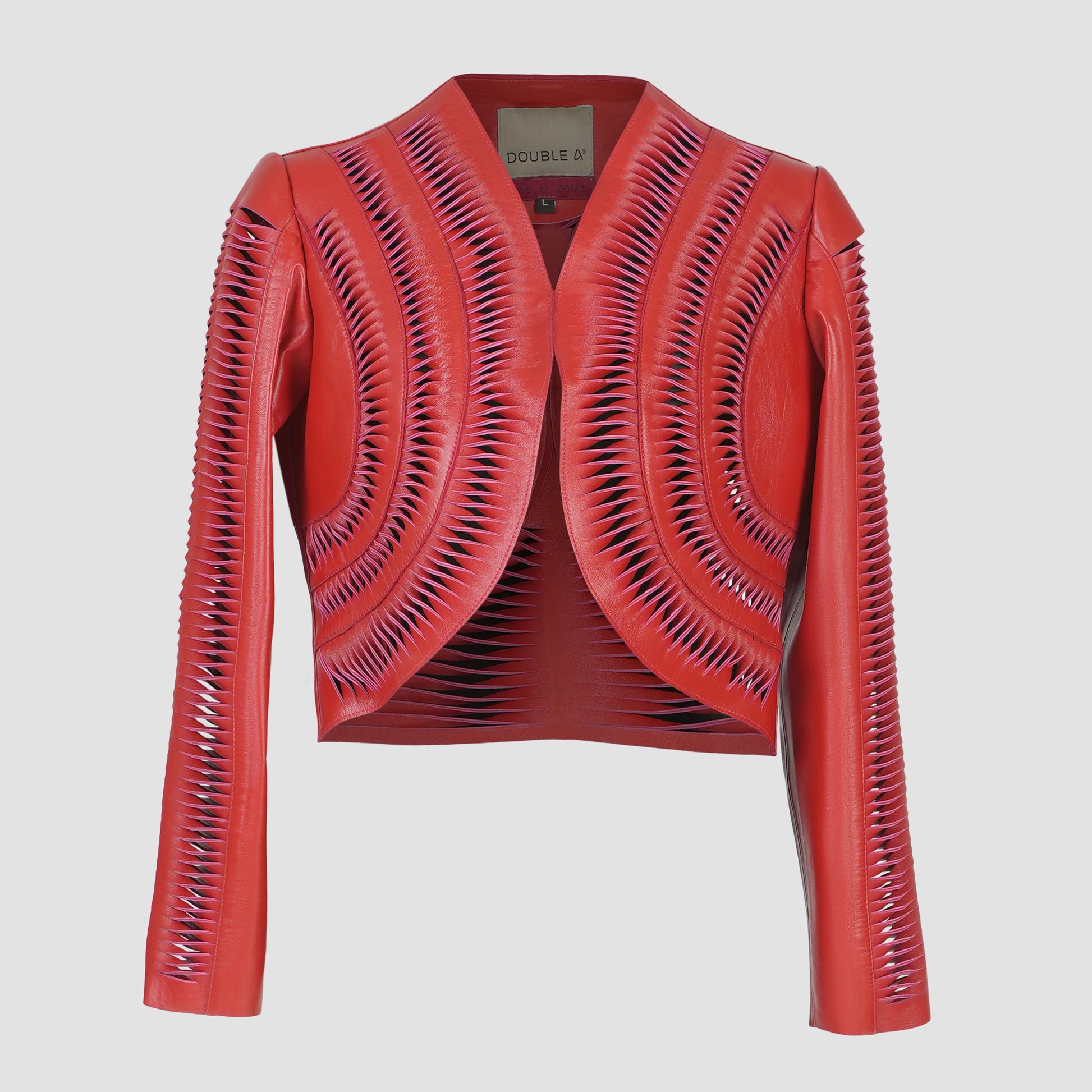 Make a bold statement with the Kiara, a leather jacket designed to captivate. Featuring intricately braided stripes aligned in a circular pattern, this piece creates a striking round-shaped. The front is elegantly fastened with a sleek metal hook, adding a subtle edge to its design. Perfect for layering over minimal basics, this vest transforms any outfit with its unique craftsmanship, delivering a touch of glamour and sophistication to your look.