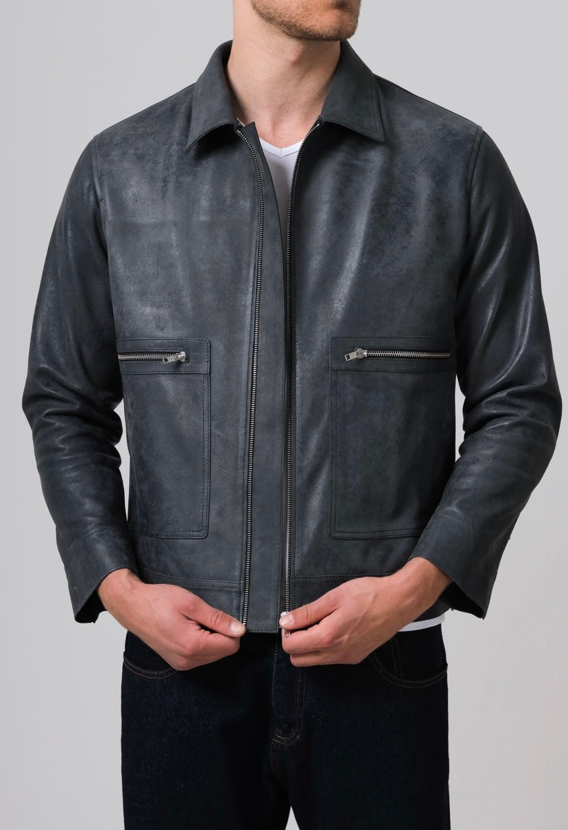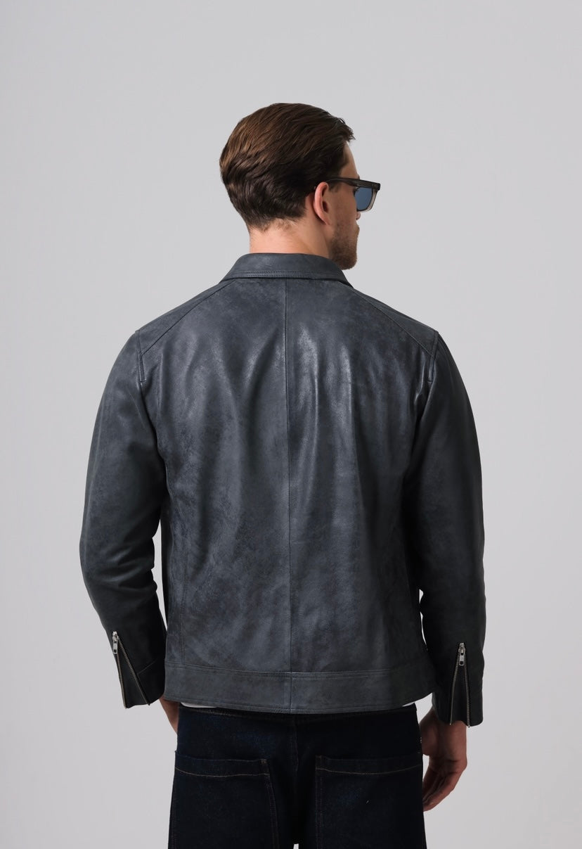 The Logan is a genderless leather jacket, it features lapel collar, patch pockets with zip, inside pocket, and front zip fastening.