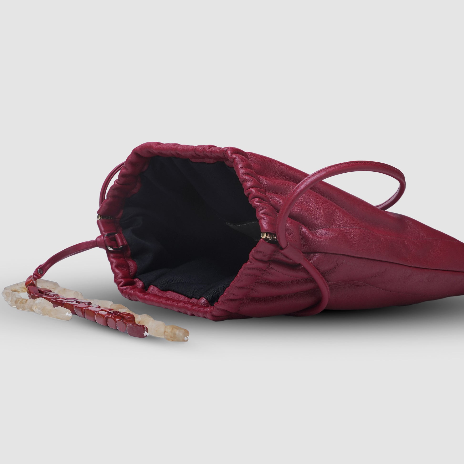 Elevate your evening look with this statement leather clutch, designed with both function and flair in mind. It features a sturdy inner frame that allows for effortless opening and closing, while the leather handle adds comfort and a sleek finish.