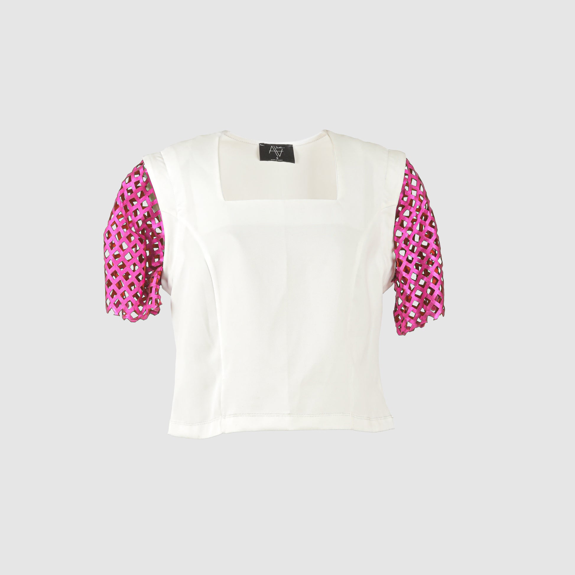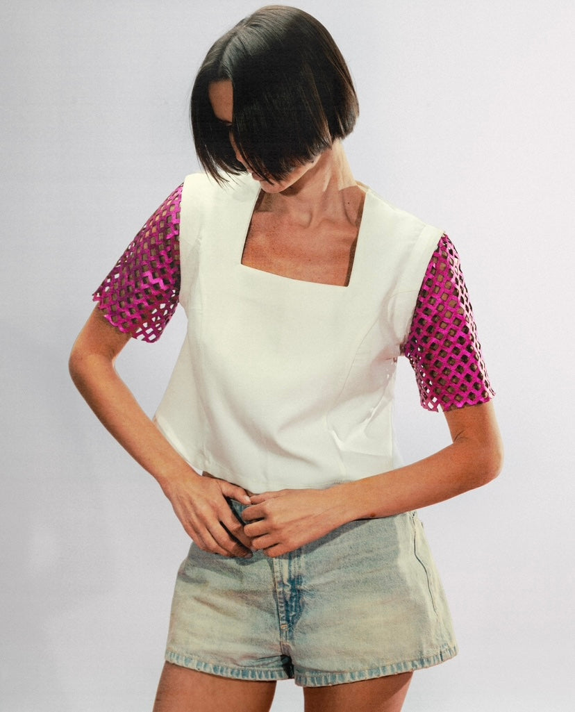 The Mia top is a fusion of contemporary design and functional innovation, this piece redefines the boundaries of fashion with its unique combination of fabric and leather. Wear the sleeves for a bold and statement-making look, exchange them with any other available colors, or transform the top into a sleeveless style for a more understated vibe.
