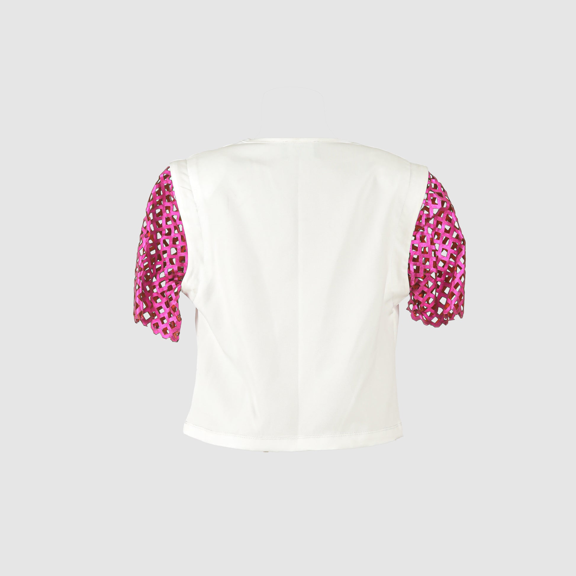 - A fabric top featuring detachable leather sleeves with zipper and laser cut details.