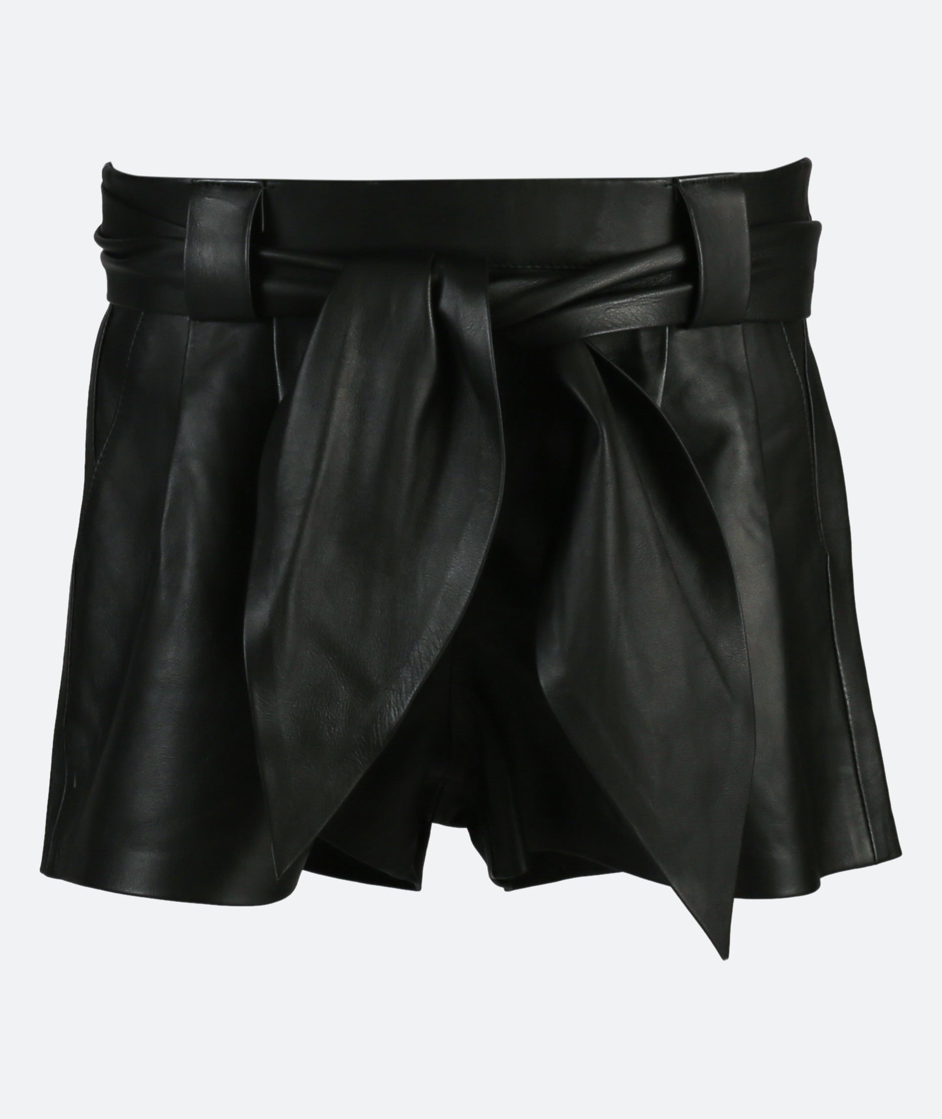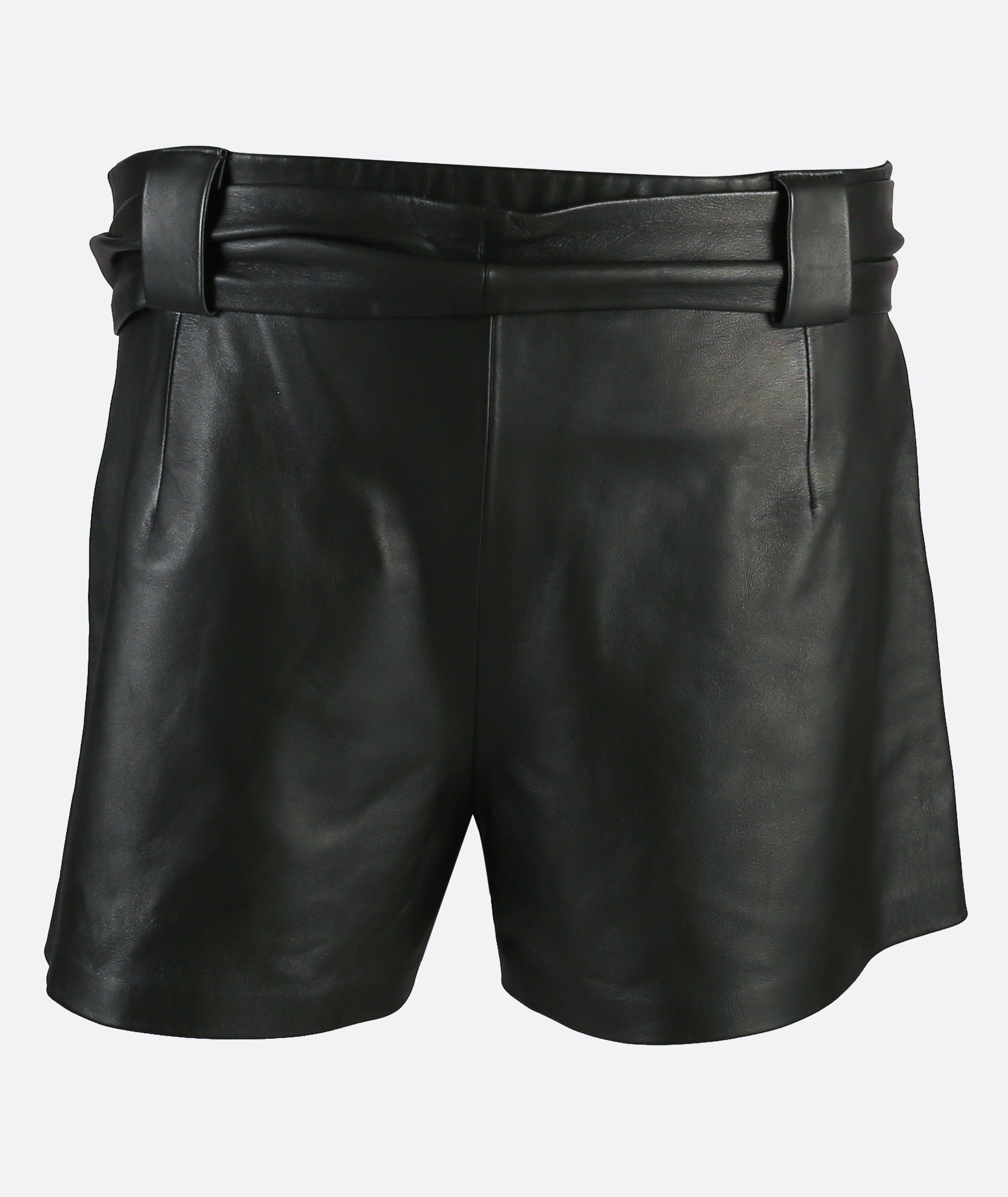 - Leather shorts with elastic waistband, removable belt, and side pockets