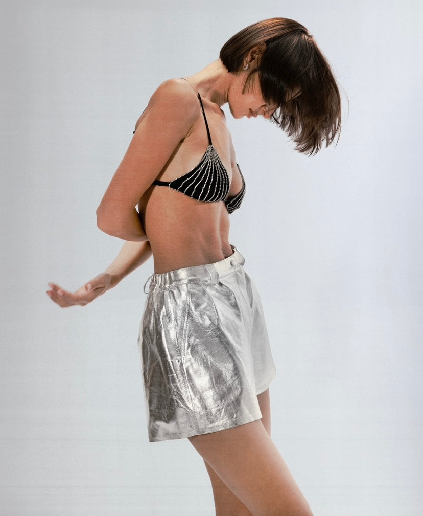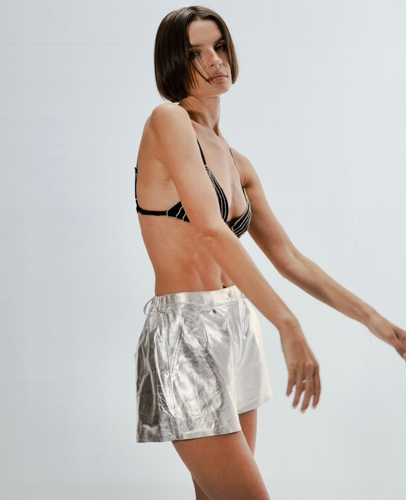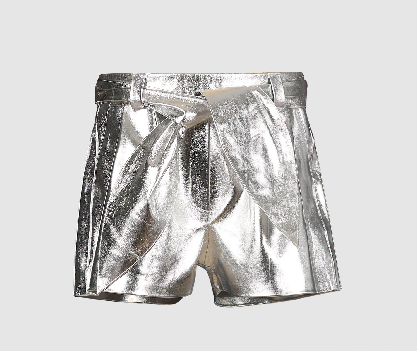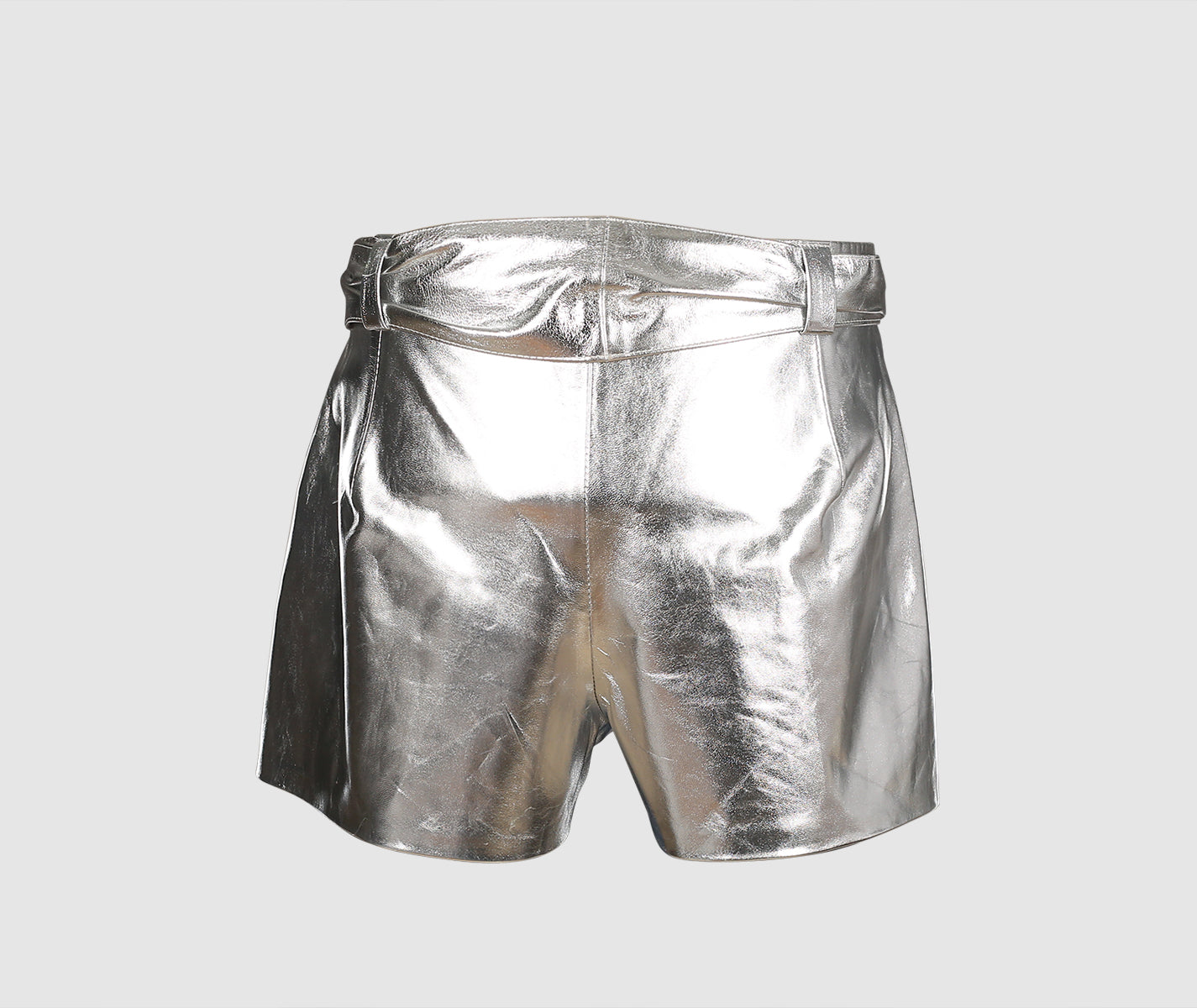 - Leather shorts with elastic waistband, removable belt, and side pockets