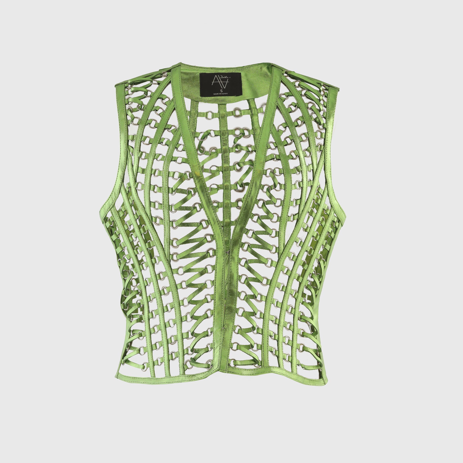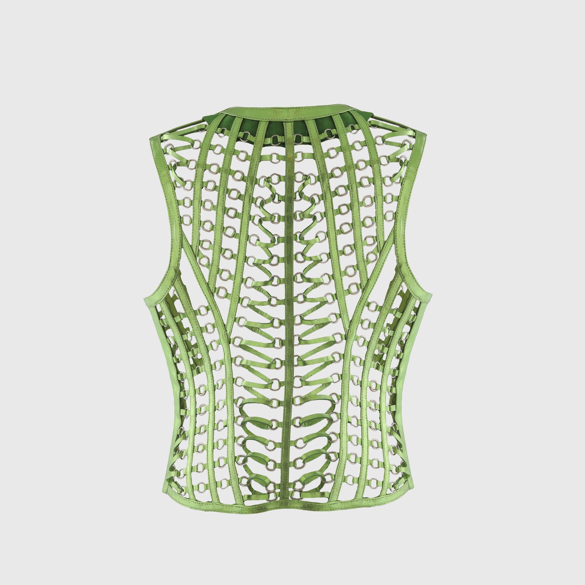 - Sleeveless leather vest featuring metal eyelets interlaced with leather straps