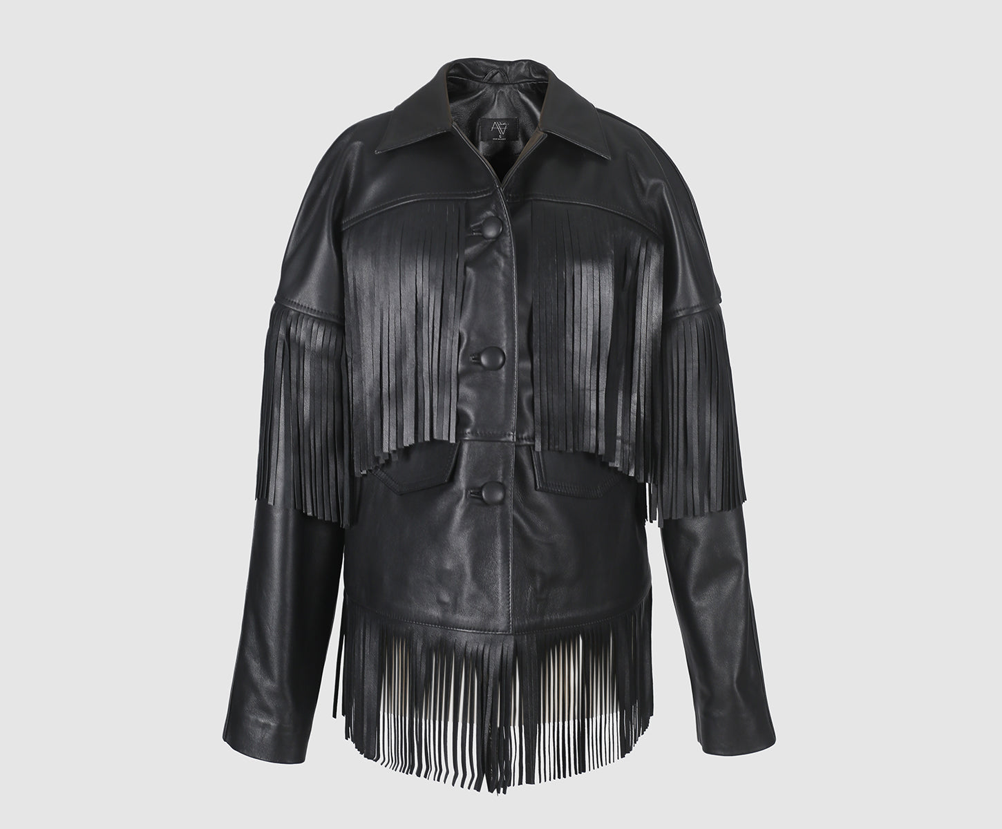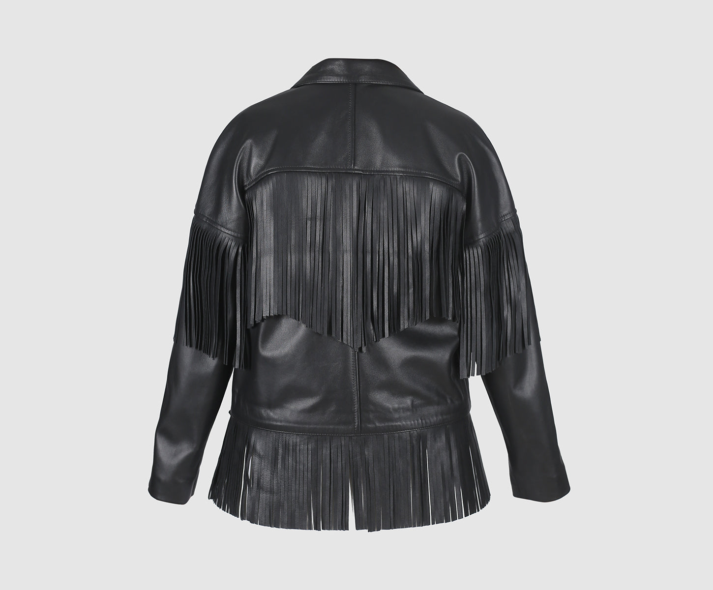 The pyrus leather jacket is a must have for every season! It is an over-sized leather jacket cut from luxurious leather and features fringes on the chest, back, and hem with patch pockets and front fastening with matching covered buttons. You will need this jacket to complement any outfit.