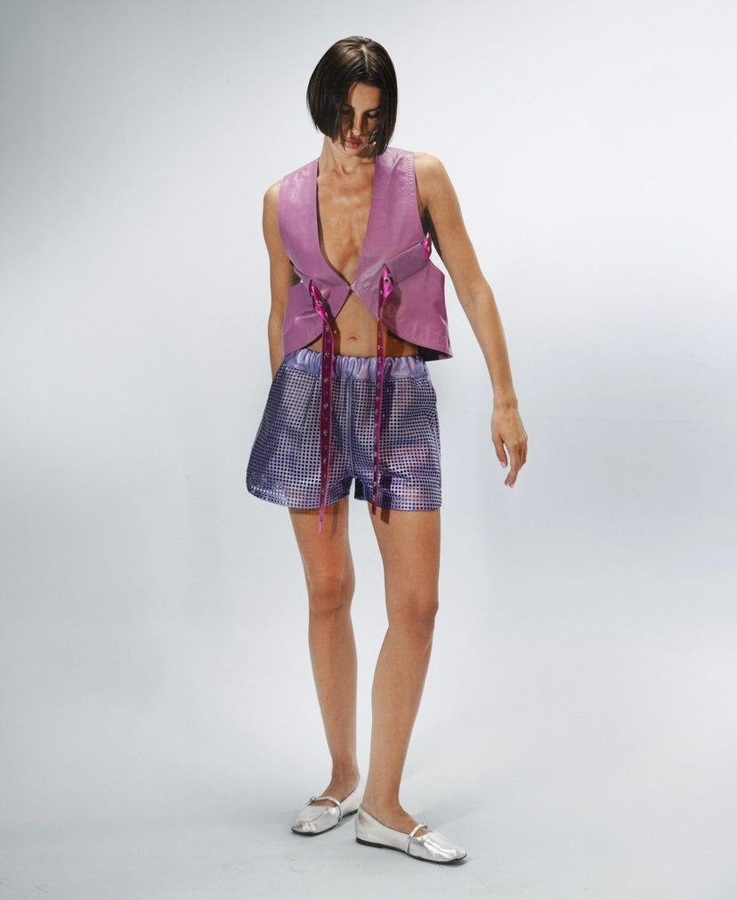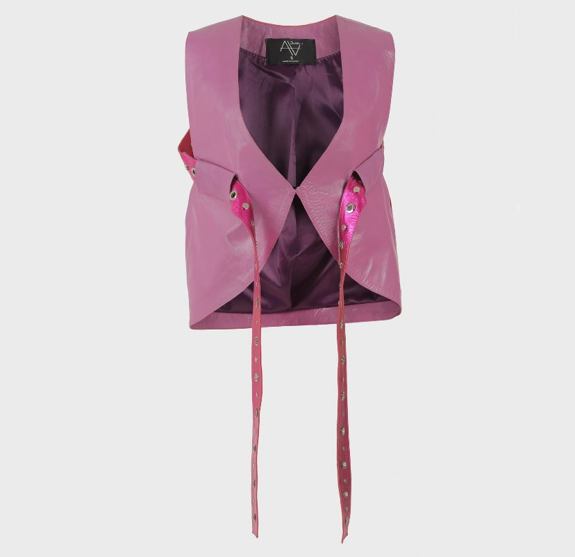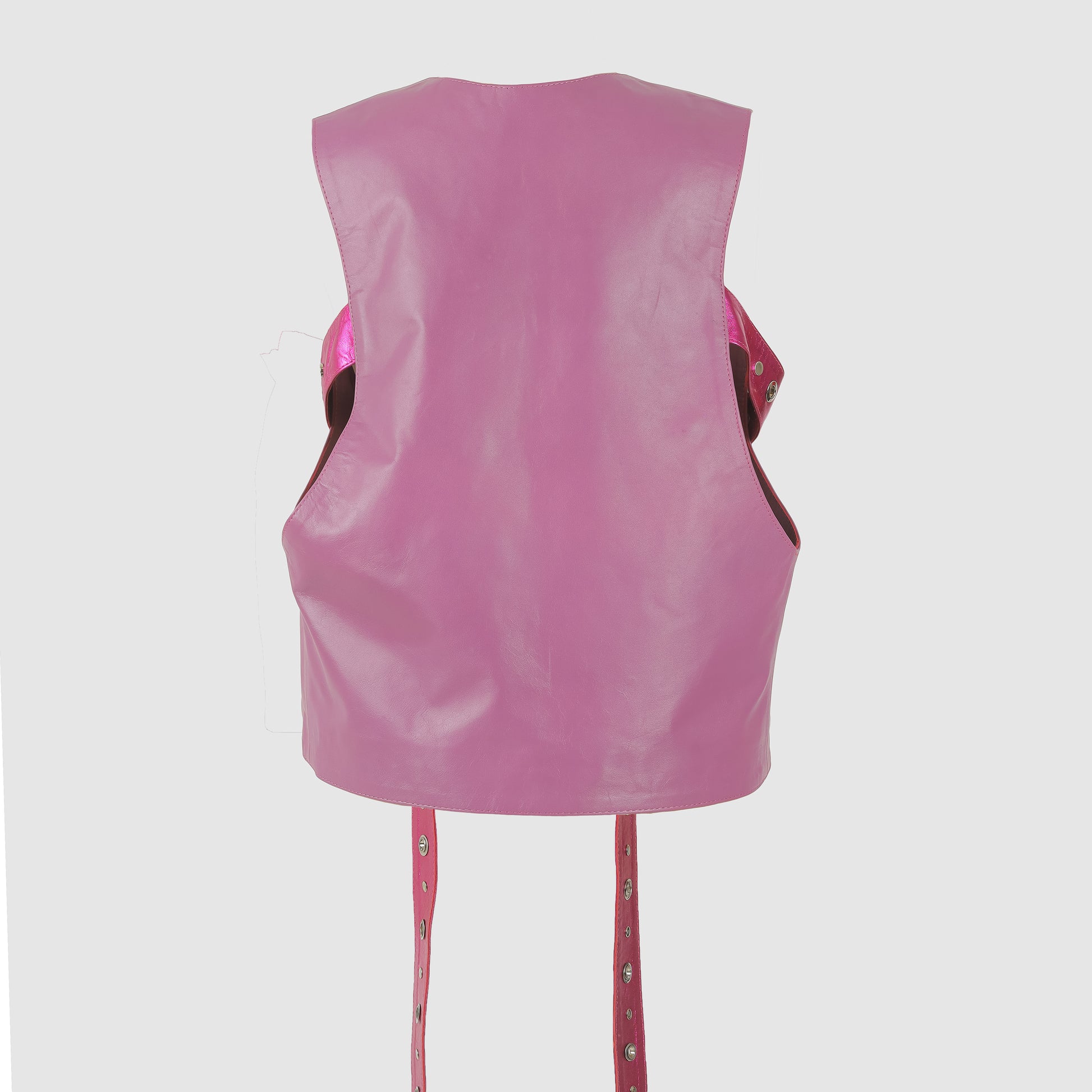 - Sleeveless leather vest with a long attached belt with eyelets and studs details.