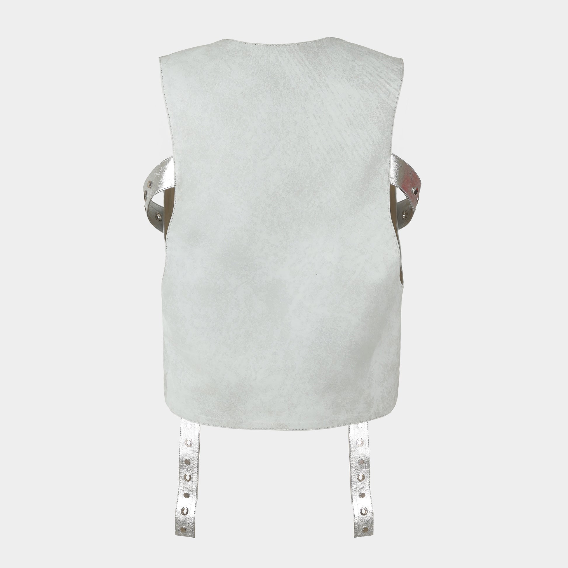 - Sleeveless leather vest with a long attached belt with eyelets and studs details.