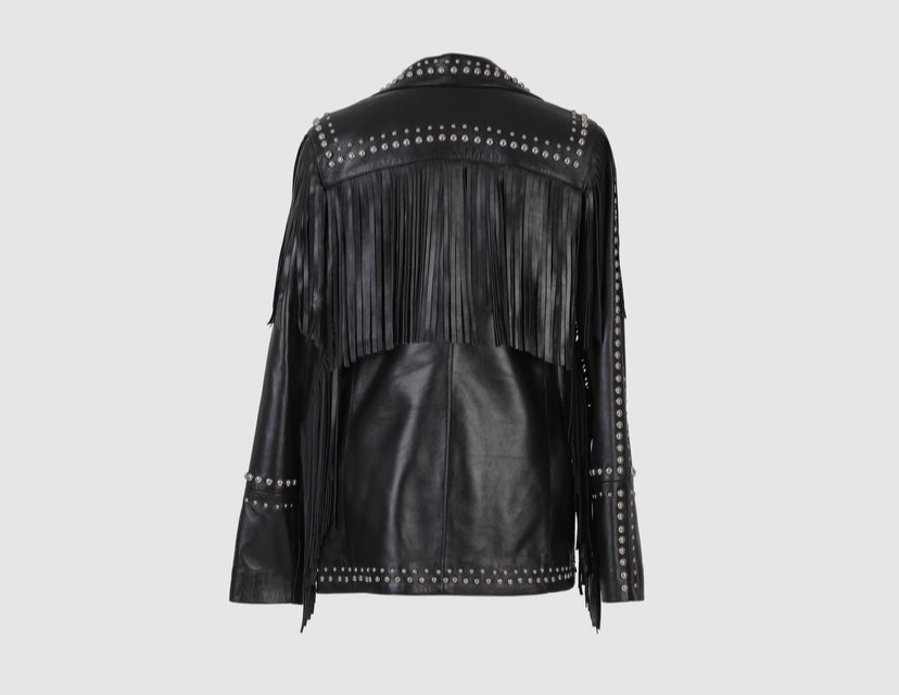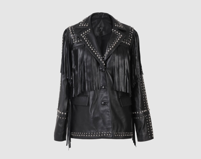 The Scarlett oversized leather jacket is an icon statement piece to your wardrobe! This iconic piece is embellished with two sized silver studs to add more contrast and cool vibe. It features lapel collar and fringes at the front, back and sleeves.Β
