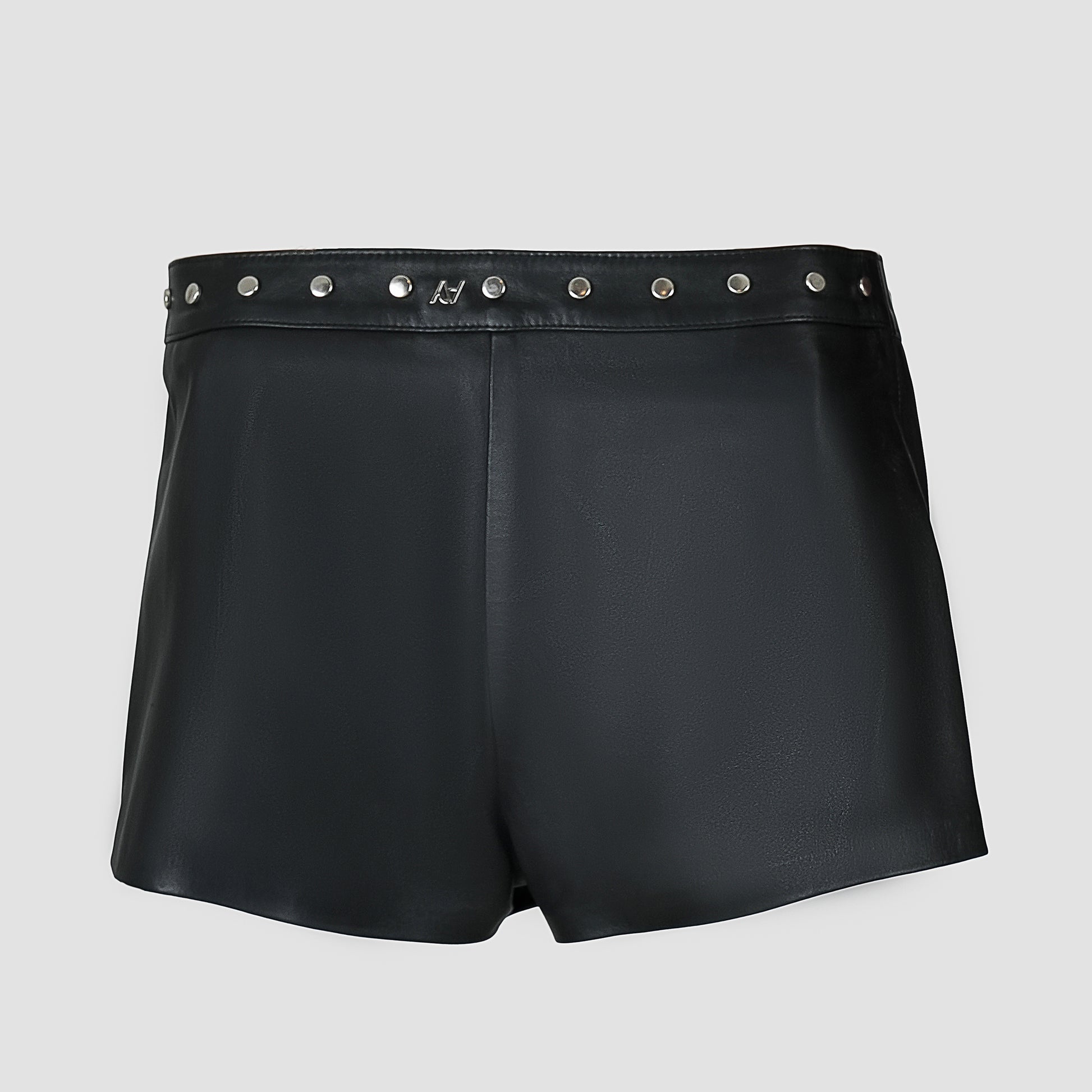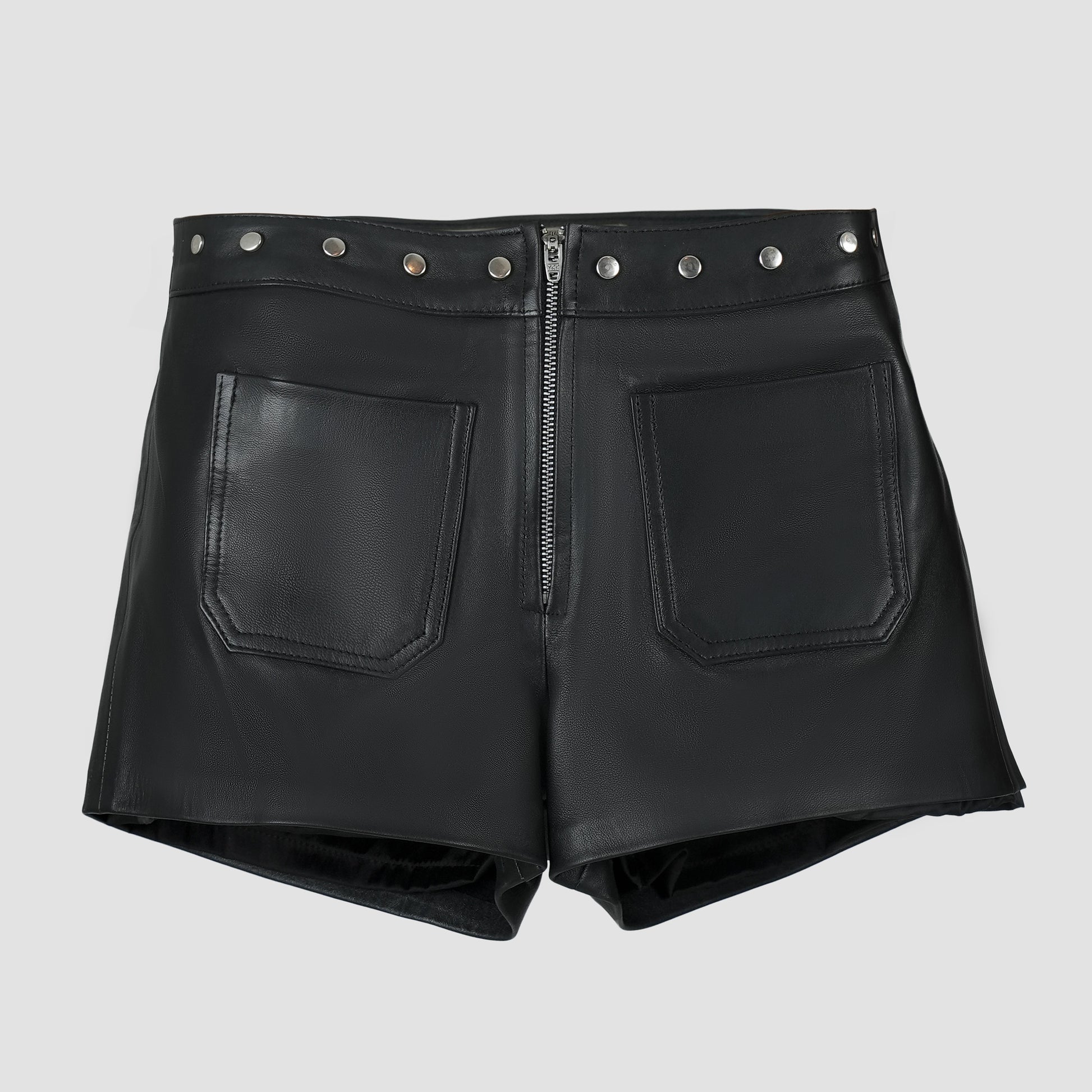 The Sterling brings an effortlessly cool edge to classic leather shorts. Designed with a bold visible front zipper and statement studs along the waistline, these shorts exude attitude and modern sophistication. Two front pockets add both function and style, making them a go-to piece for a striking, edgy look. Pair them with a sleek top and boots for a bold statement or dress them down with a relaxed tee for a casual-chic vibe.