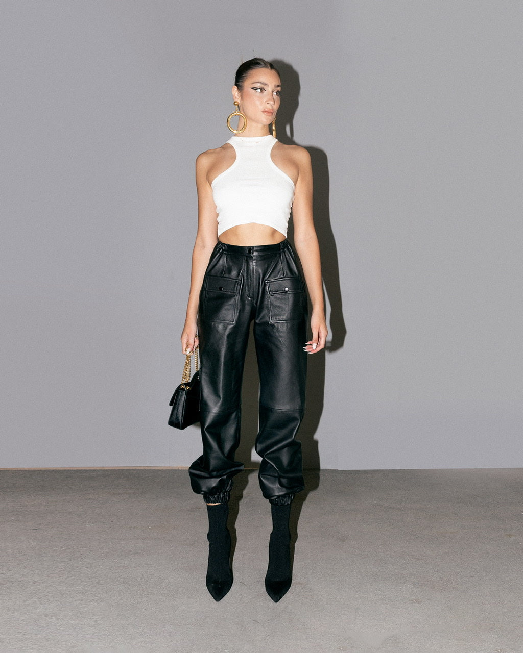 The tempest cargo pants are made from soft leather to make it comfortable to wear. It features elastic waistband for extra comfy feel, patched pockets, and cuffed elastic hems. Style it on a crop top or on theย lennox jacketย for an extra glamour look.