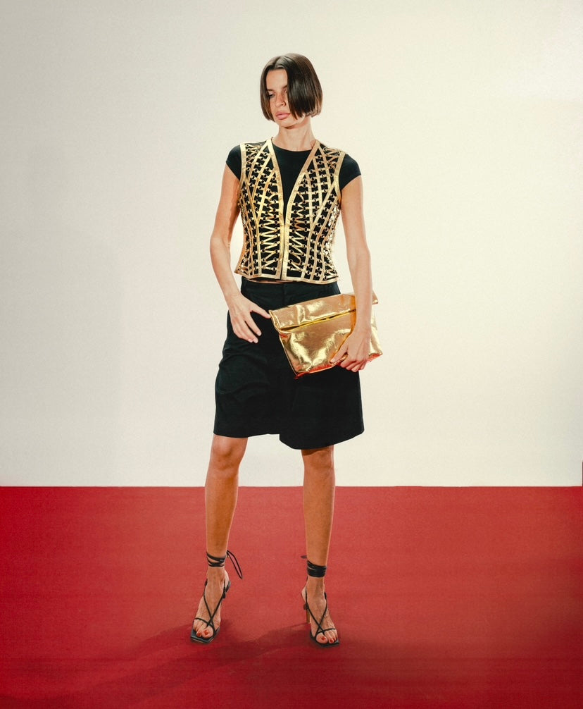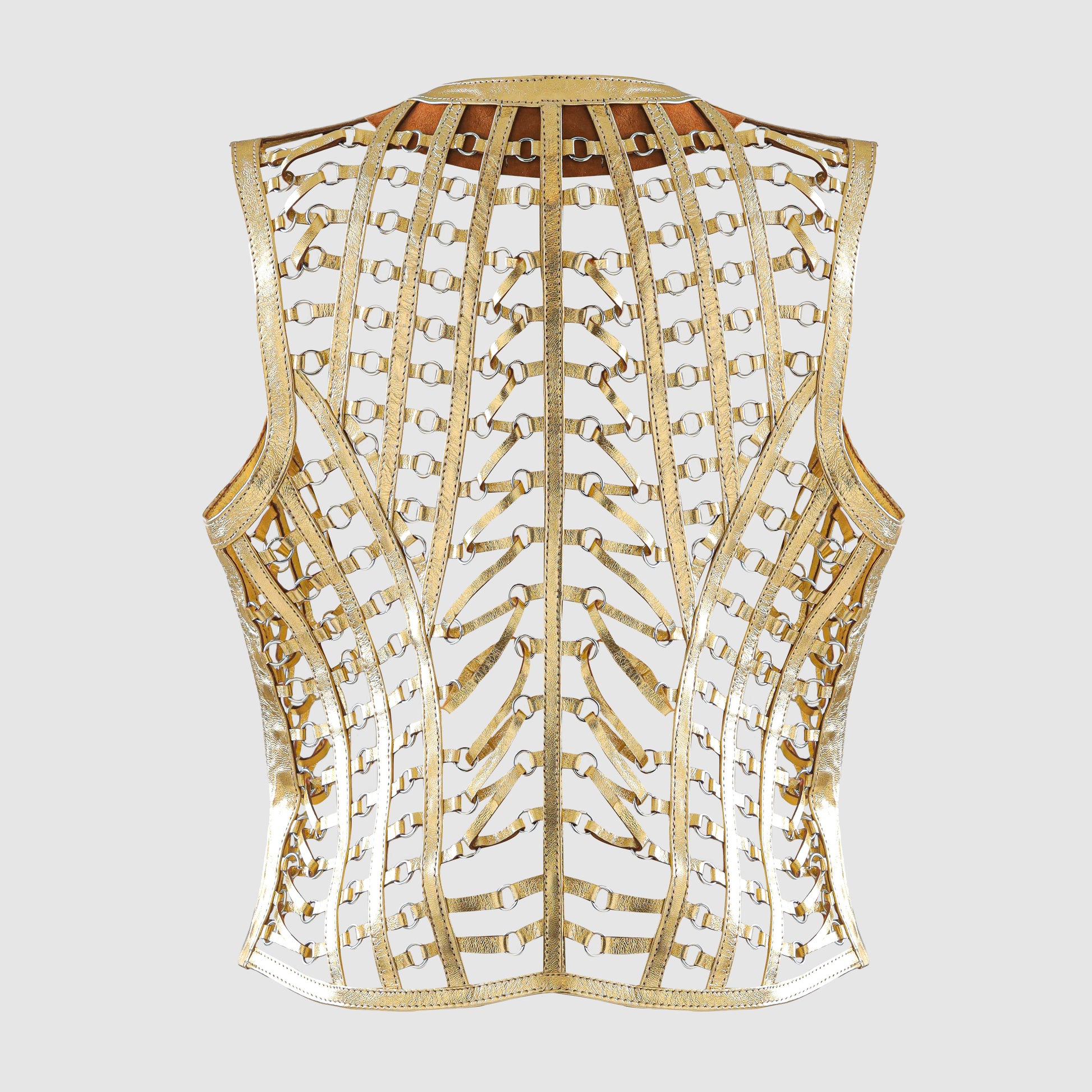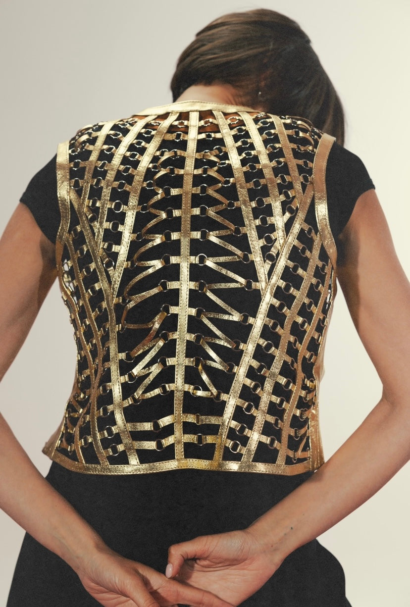 - Sleeveless leather vest featuring metal eyelets interlaced with leather straps