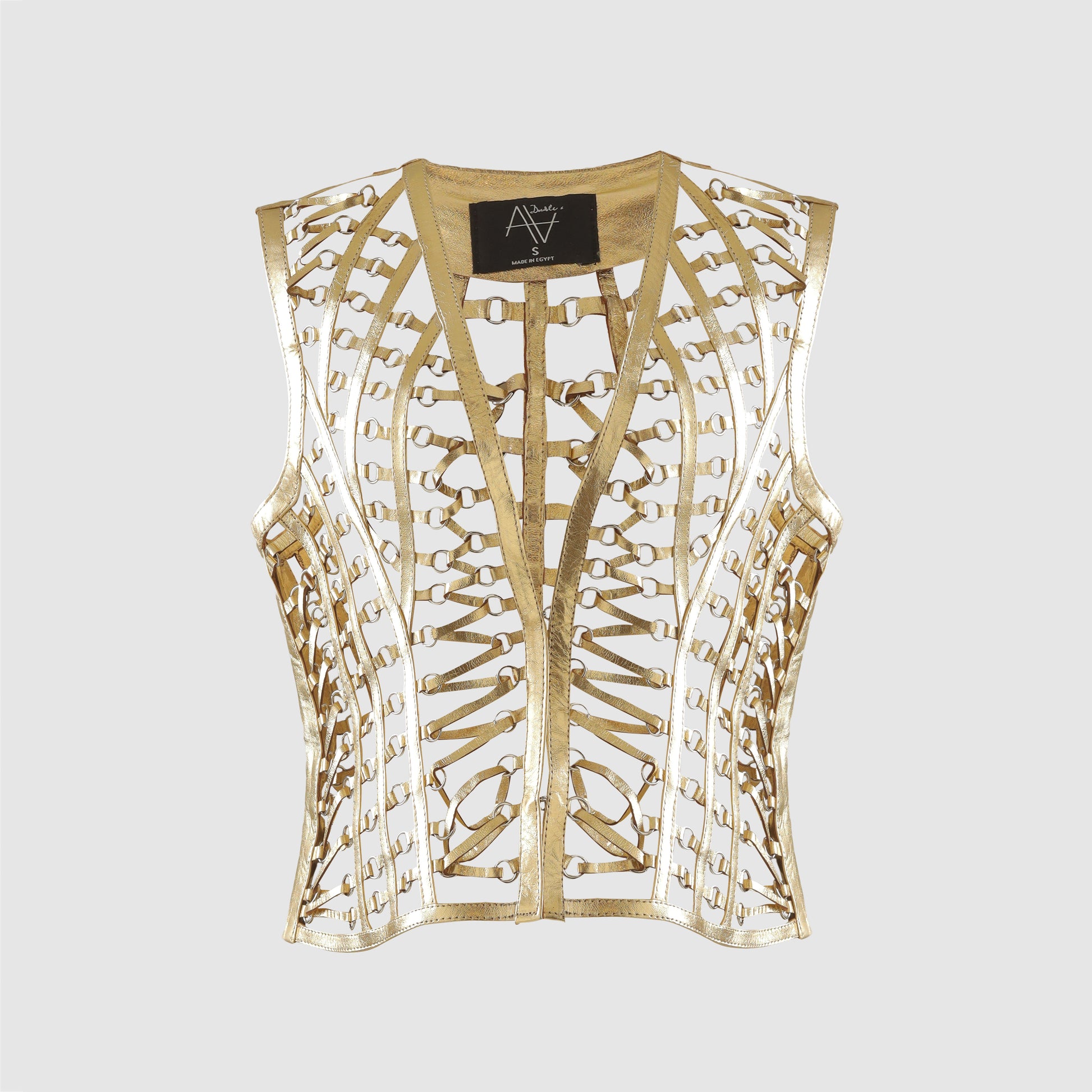 The Phoneix Leather vest is a true masterpiece that will instantly uplift any look. It features metal eyelets interlaced with leather straps from the front and the back.
