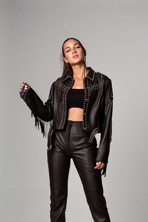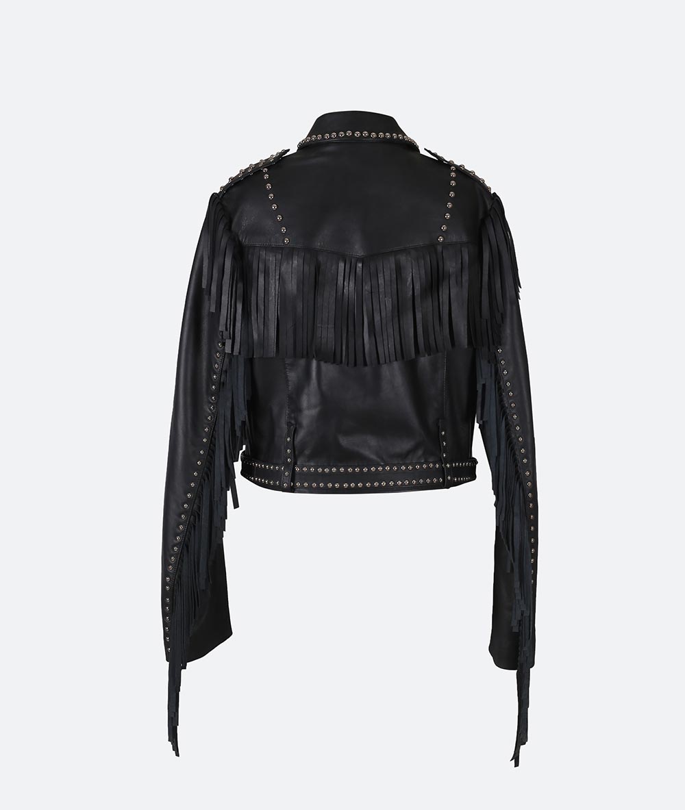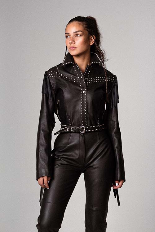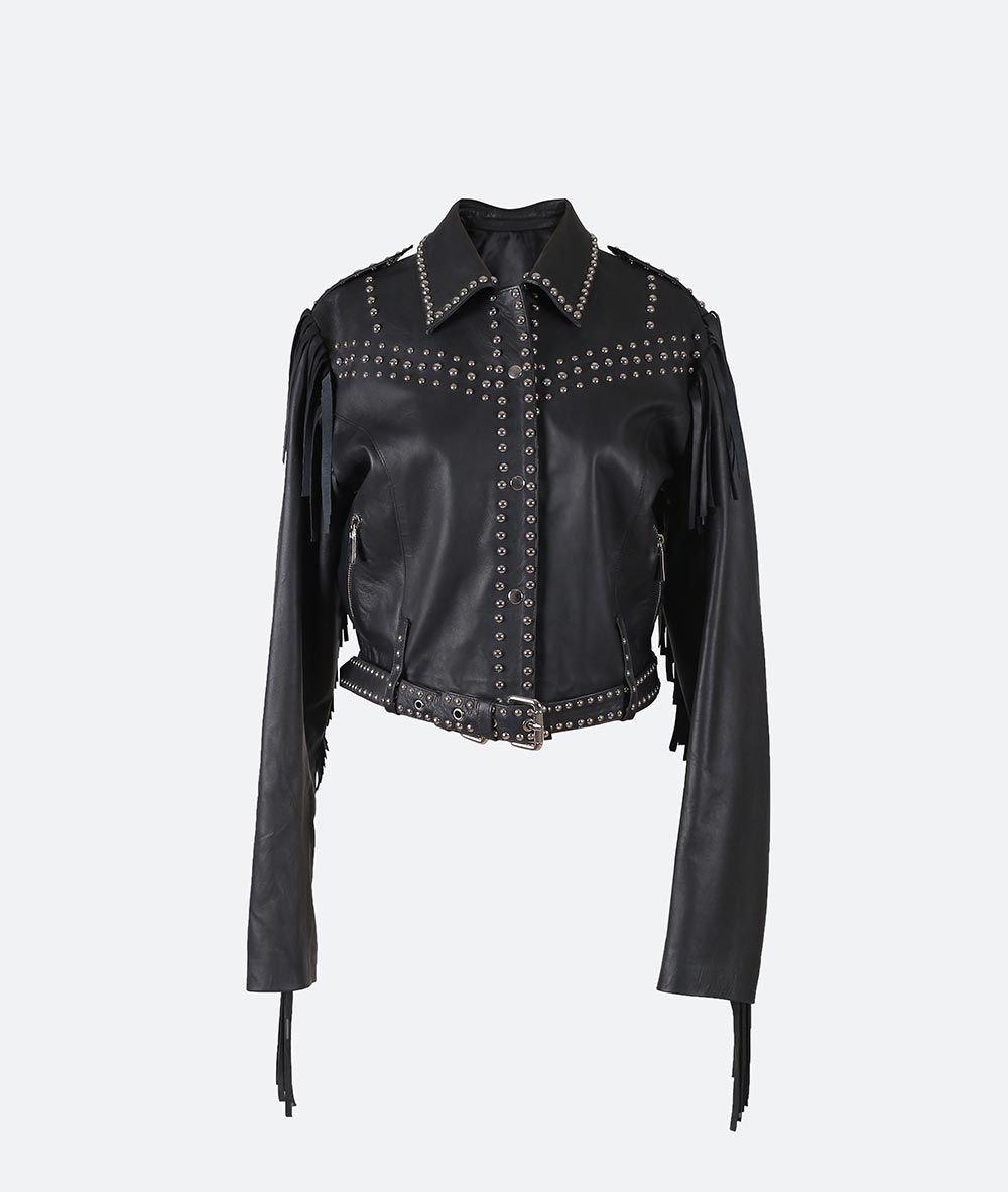 The venus leather jacket is created for all the fans of cropped leather jacket and it exceptionally features metal studs and fringes details.