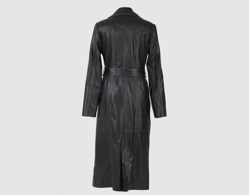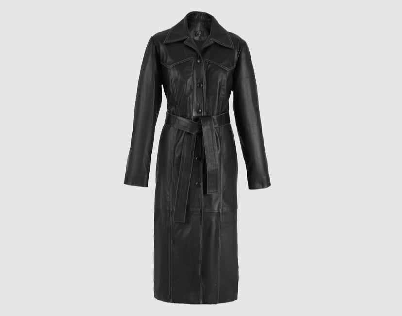 Straight fit leather coat balancing cool andย effortless glamour, with its special leather texture. It features white stitching, length adjustable belt at the waist, and front fastening with matching covered buttons.ย